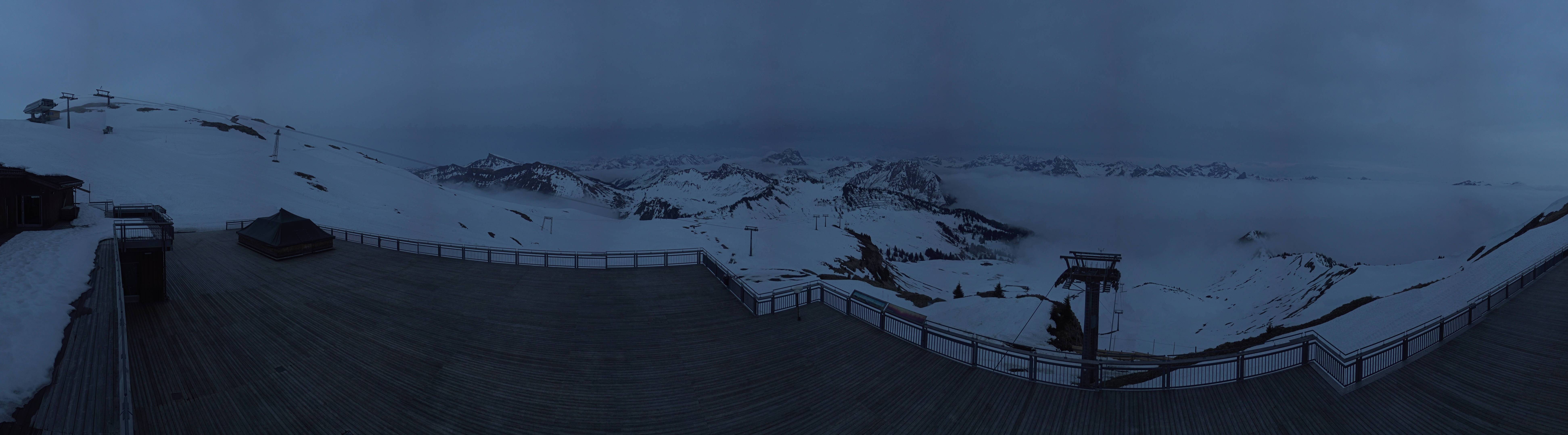 Von der Bergstation der Seilbahn Diedams am Diedamskopf zeigt die Kamera die Bergstation der Panoramabahn und den Blick hinab ins Tal in Richtung Au und Schoppernau.