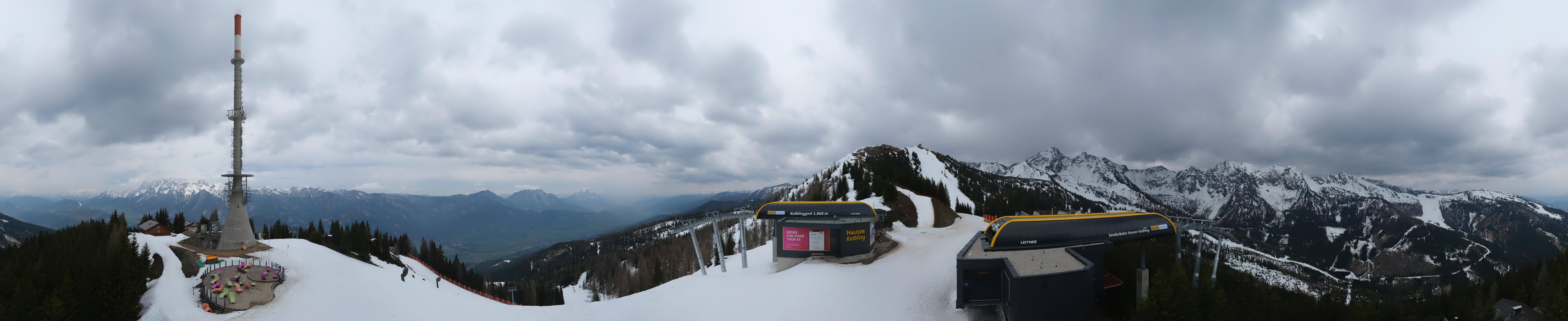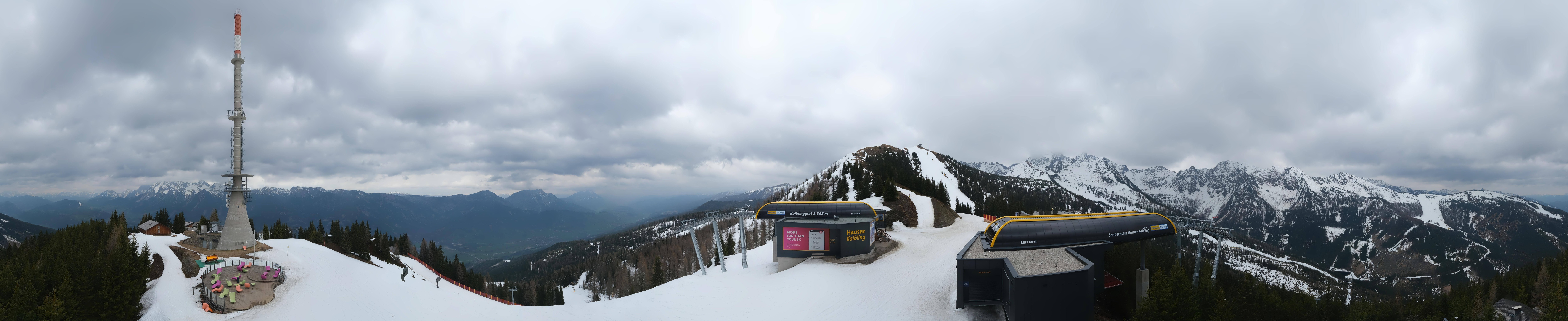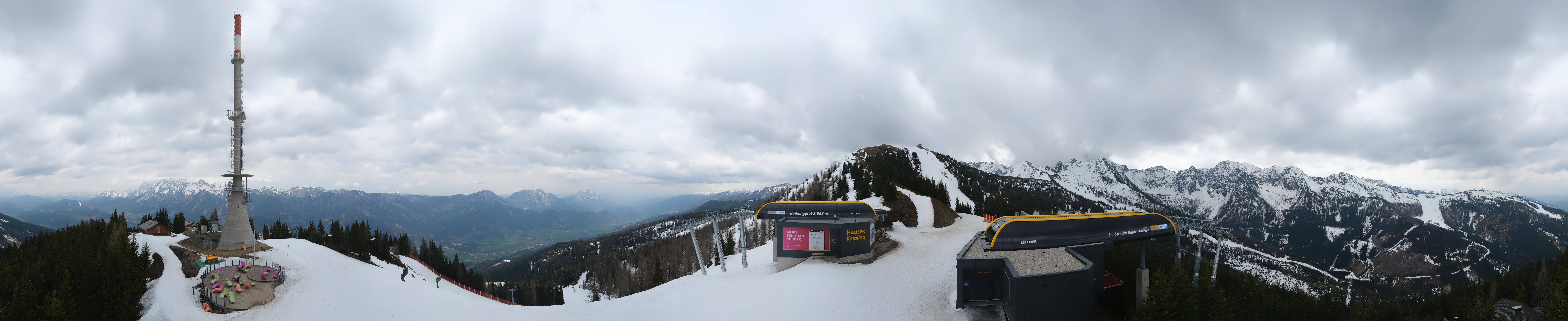 Diese Webcam gibt dir einen Panoramablick auf das Senderplateau im Skigebiet Hauser Kaibling. Hier befinden sich die Bergstationen der 8er Sesselbahn Kaiblinggrat und der Senderbahn (10er Gondel). Zu sehen sind unter anderem der Gipfel des Hauser Kaibling (2015 m) und natürlich der Sendemast.