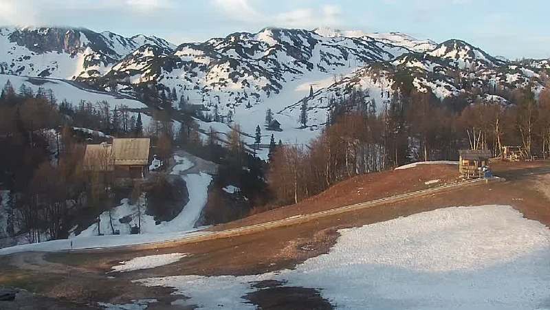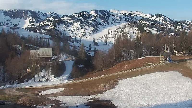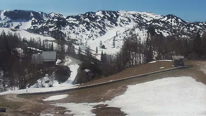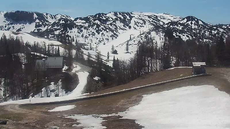 Von der Bergstation der Vogel Gondelbahn auf einer Höhe von etwa 1500 Metern zeigt die Webcam den Blick auf die Pisten im oberen Bereich des Skigebiets.