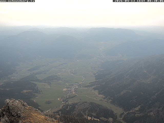 Die Webcam eröffnet den Fernblick vom Berghaus Hochschneeberg ins Tal nach Puchberg am Schneeberg (Niederösterreich).