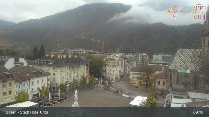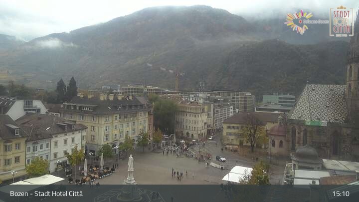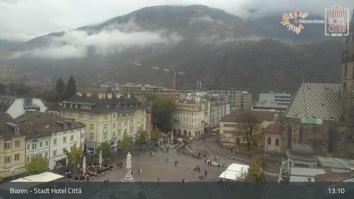 Die Webcam blickt vom Stadt Hotel Città auf den Waltherplatz in Bozen. Die Kamera zeigt auch den Bozener Dom Maria Himmelfahrt.