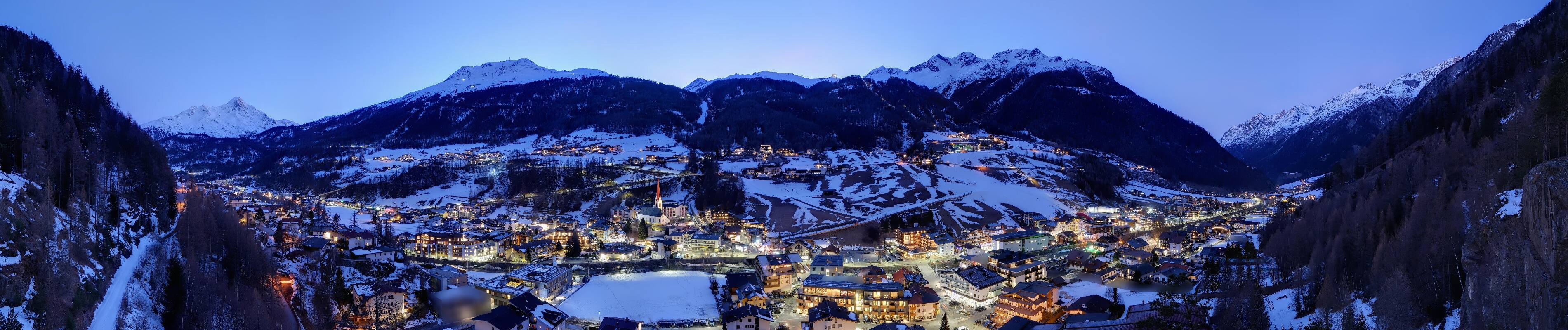 Toller Panoramablick auf Sölden im Ötztal. Die Kamera ist oberhalb der Freizeit Arena positioniert und gibt einen guten Überblick über den beliebten Tiroler Skiort.