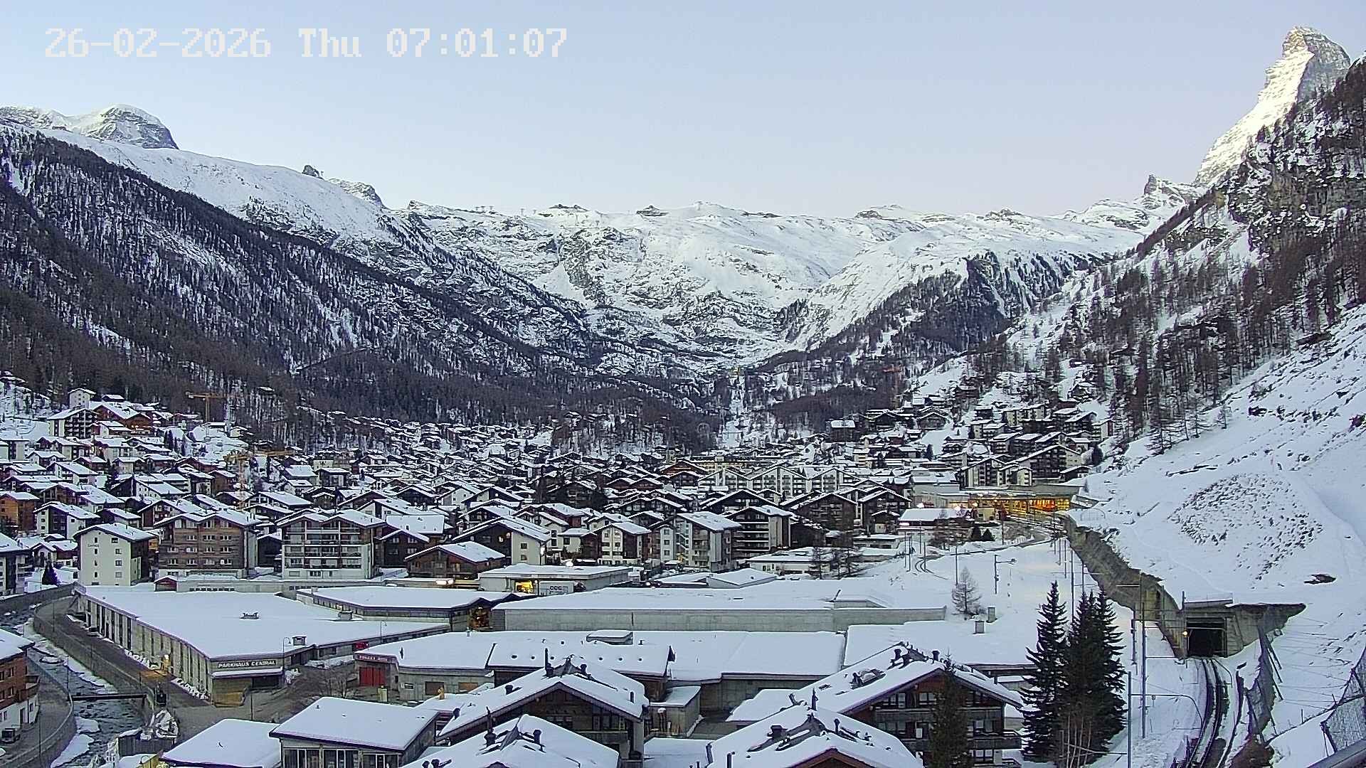 Archiviertes Webcam Bild: Zermatt: Blick über das Dorf von Spiss am 26 Feb 2026 um 07:28 Uhr 06:00