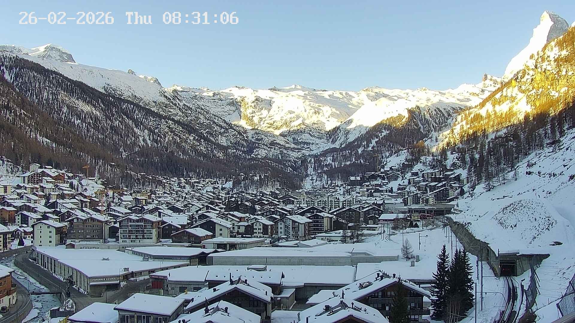 Archiviertes Webcam Bild: Zermatt: Blick über das Dorf von Spiss am 26 Feb 2026 um 08:28 Uhr 07:00