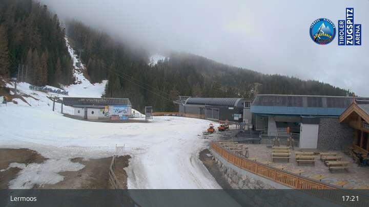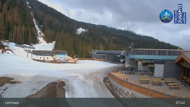 Hier siehst du die Bergstation des Hochmoos Express im Skigebiet Lermoos in der Tiroler Zugspitz Arena.