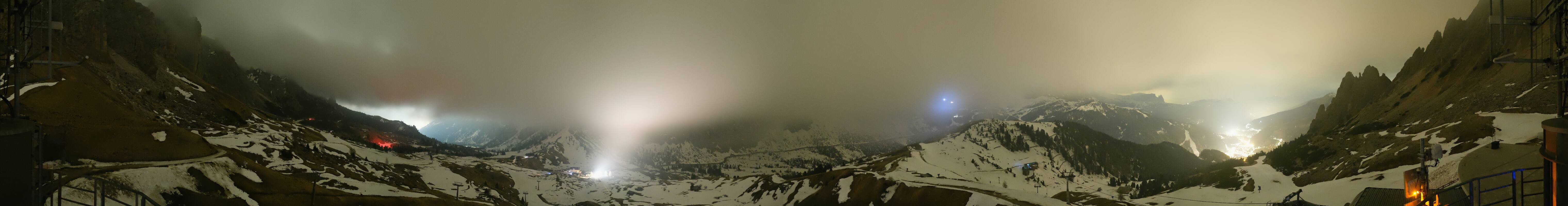 Blick vom Dantercepies Richtung Wolkenstein. Im Hintergrund erkennt man den Sellastock und den Langkofel. Auch die berühmte Skirunde Sella Ronda macht hier am Dantercepies Station. Hinunter nach Wolkenstein führt eine der schönsten Talabfahrten der Region.