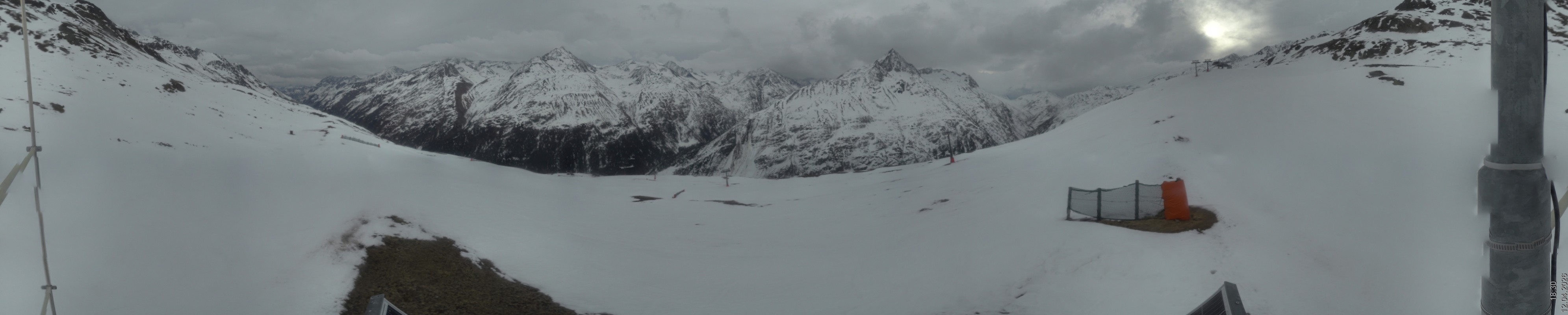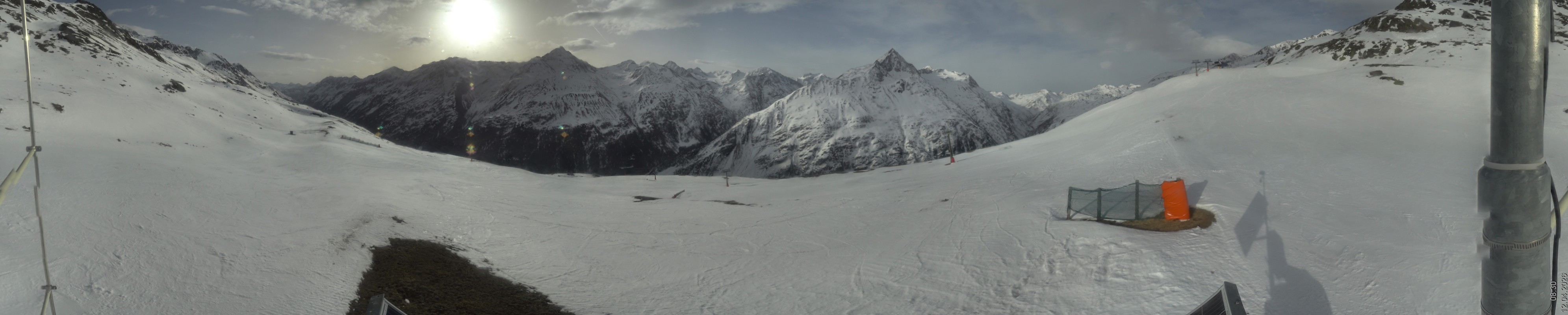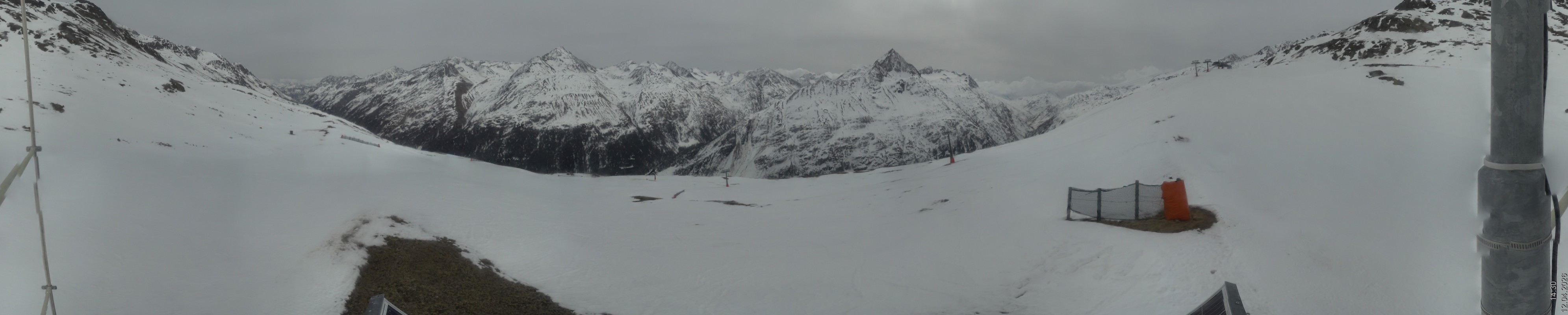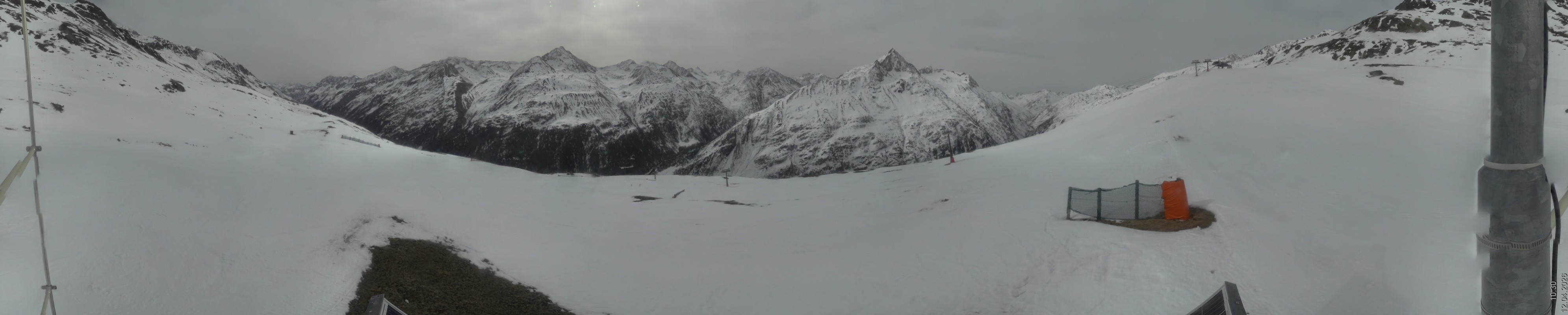 Ausblick vom Skigebiet Vent im Tiroler Ötztal auf die umliegende Bergwelt und das Dorf Vent. Die Webcam ist kurz vor der Bergstation des Sessellifts Wildspitze angebracht. Zu sehen ist auch das Panoramarestaurant Stablein.