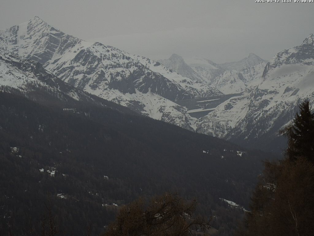 Aus Richtung Les Masses im Skigebiet 4 Vallées ermöglicht die Webcam einen Blick in Richtung des Grande Dixence Stausees.