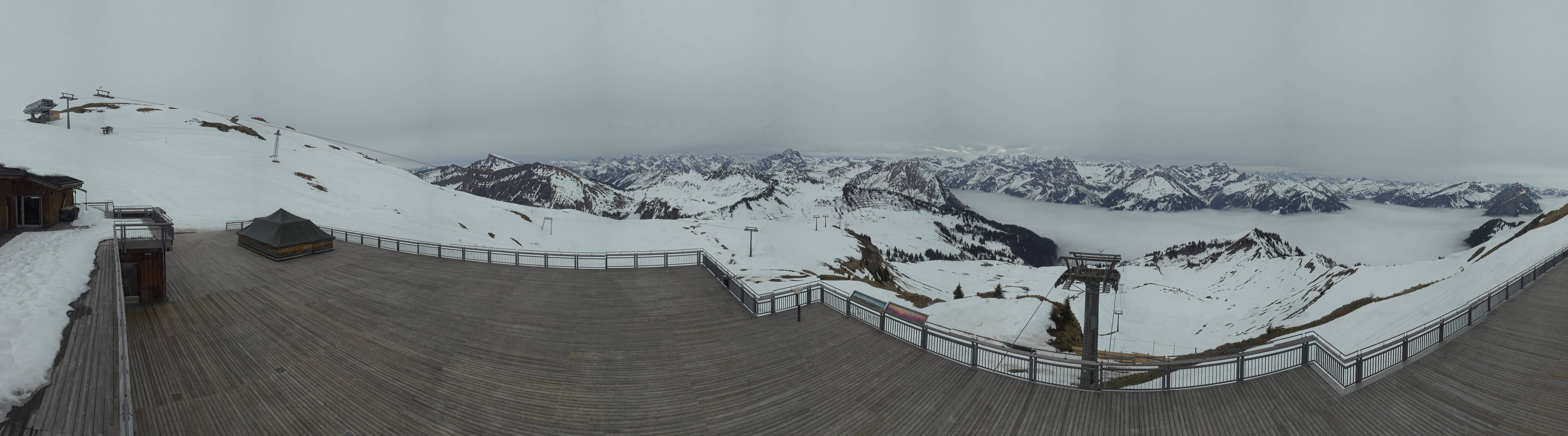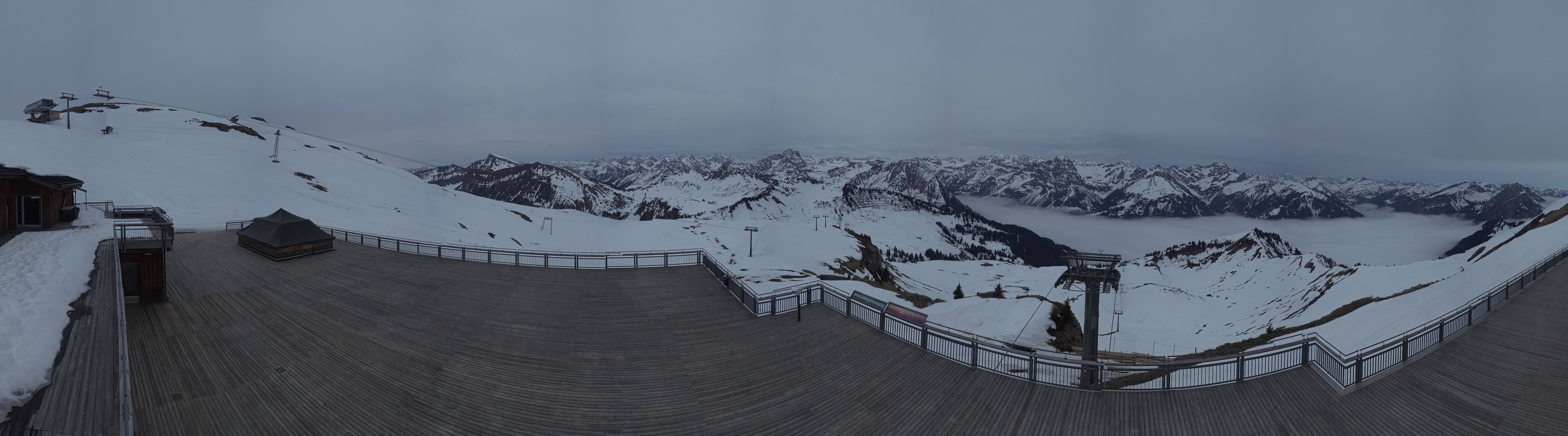 Von der Bergstation der Seilbahn Diedams am Diedamskopf zeigt die Kamera die Bergstation der Panoramabahn und den Blick hinab ins Tal in Richtung Au und Schoppernau.