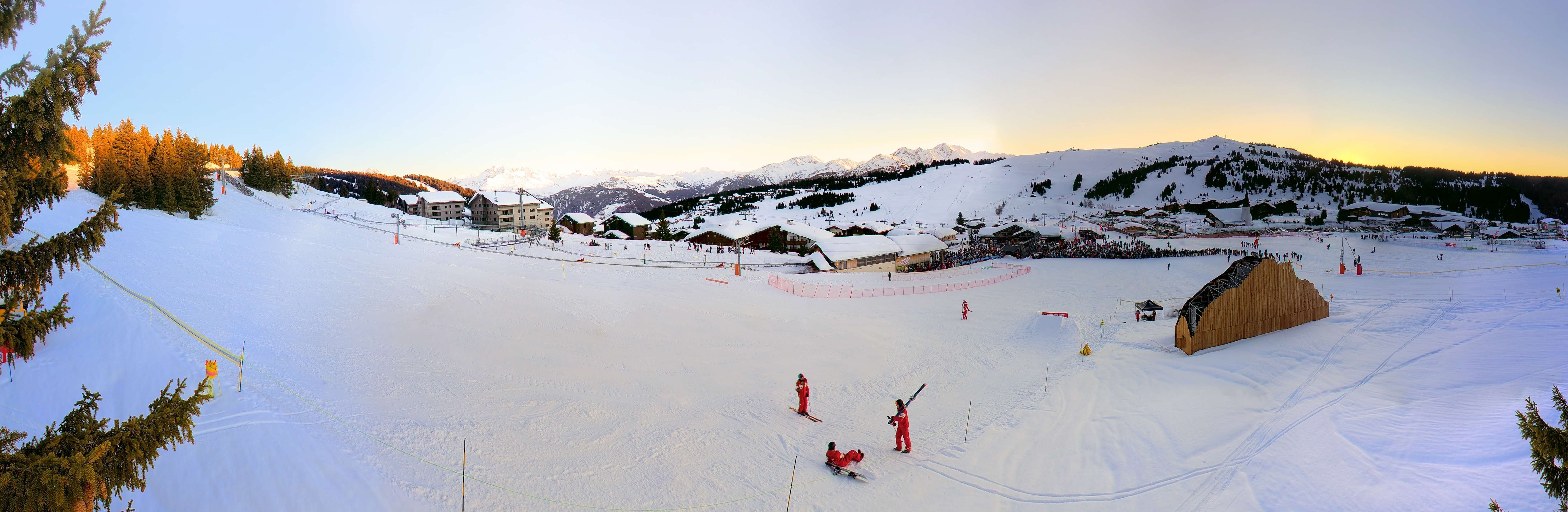 Livecam mit Rundumblick auf den französischen Wintersportort Les Saisies. Zwei Sessellifte verlaufen direkt über den Ort.