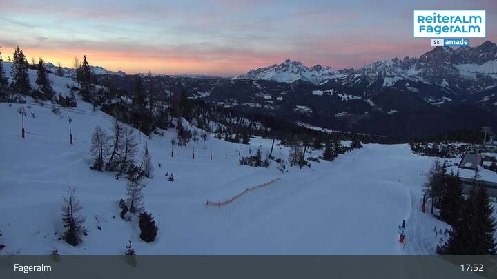 Archived webcam image showing View towards ski resort Fageralm (Schladming-Dachstein) on 26 Feb 2026 at 17:22 16:00