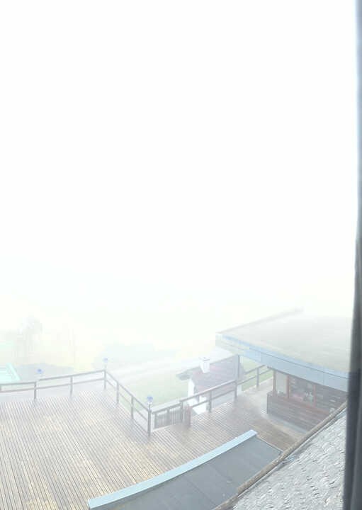 Blick vom Dach des Gasthauses tum Überleben im Skigebiet Hochficht. Gut zu erkennen ist die Terrasse des Restaurants und die Mittelstation der Reischlbergbahn.