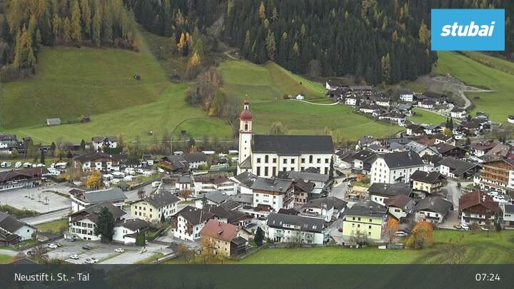 Blick über das Tal und den Ort Neustift im Stubaital.
