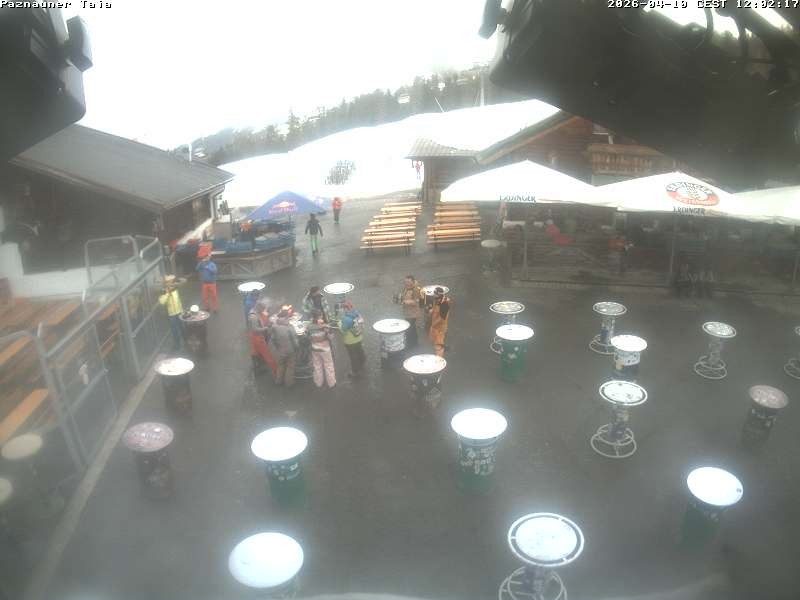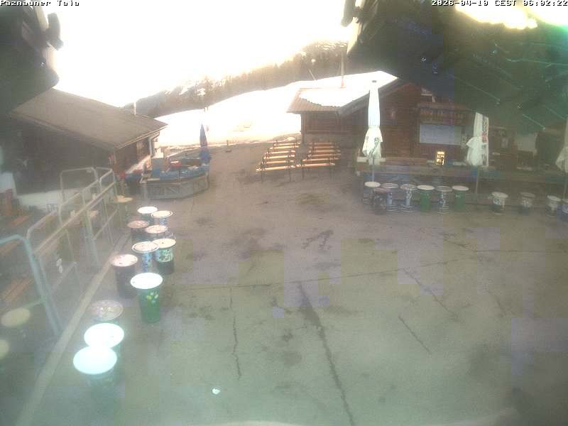 Webcam zur Terrasse der Hütte Paznauner Taja im Skigebiet von Ischgl.