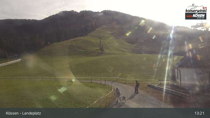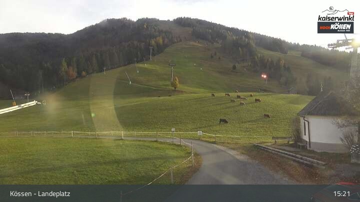 Panorama-Webcam am Kinderland im Skigebiet Kössen. Zu sehen sind neben der Skischule und dem Tellerlift auch die Talabfahrt und die Talstation.