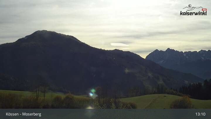 Blick vom Moserberg im Skigebiet Kössen auf die umliegende Bergwelt.