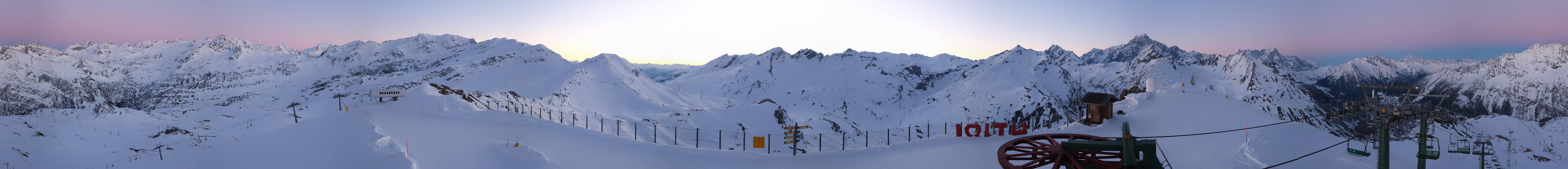 Aussicht von der Bergstation in La Thuile über das Skigebiet im Aostatal. Zudem erkennt man das Skigebiet von La Rosiere in Savoyen/Frankreich. Es ist verbunden mit La Thuile.