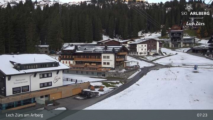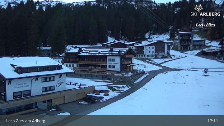 Panoramablick über die Ortschaft Oberlech am Arlberg inmitten des Skigebiets Lech Zürs.