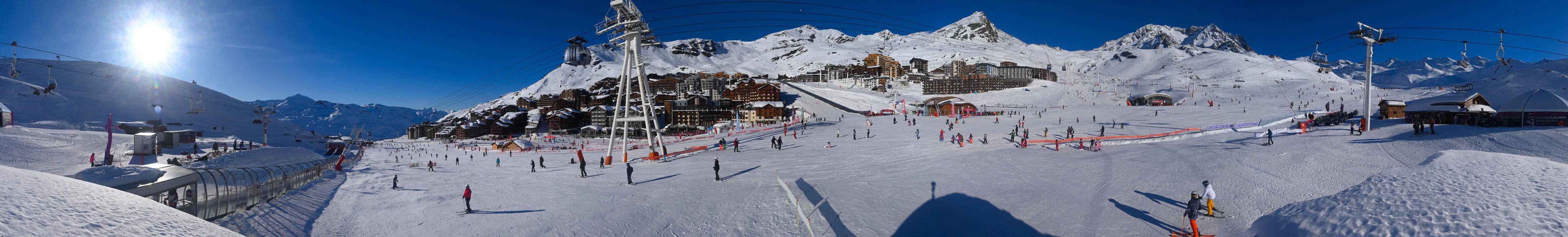 Genieße den 360°-Blick über den Talbereich in Val Thorens. Zu sehen sind u.a. die Talstationen der Gondel Funitel de Peclet, des 6er-Sessellifts Cascades und der Sesselbahn Les Pionniers.