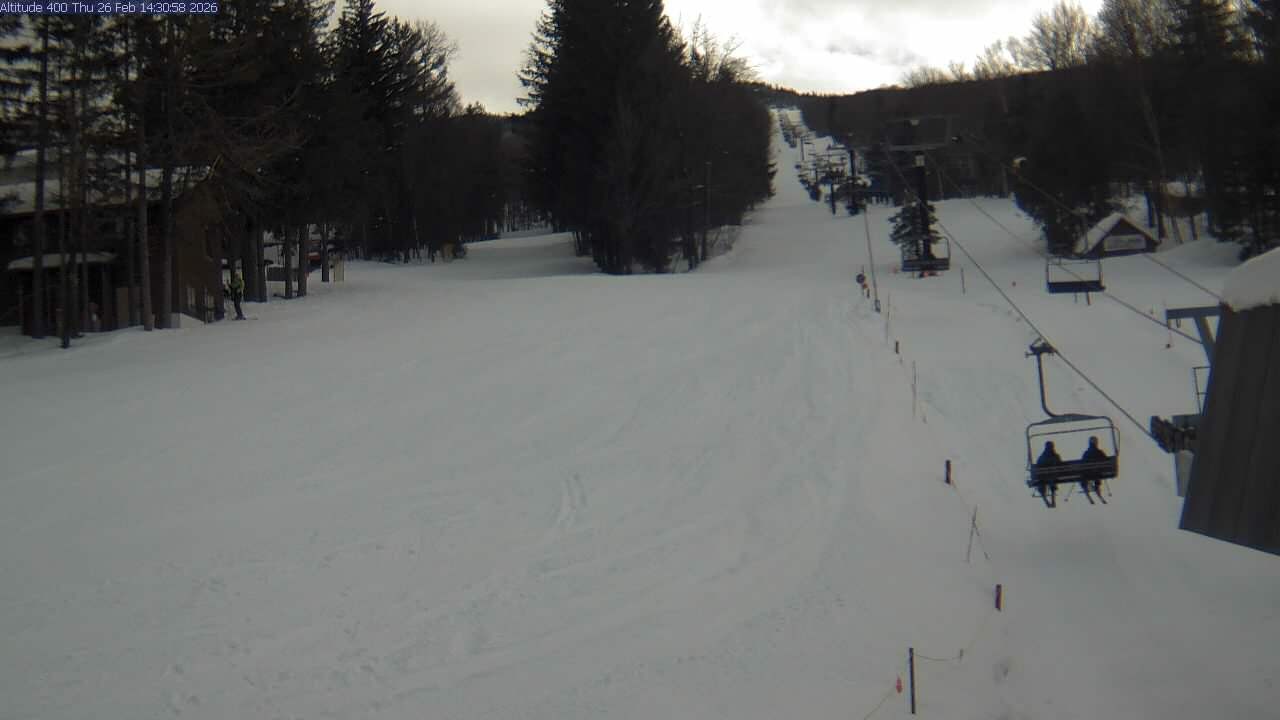 Archived webcam image showing Mont Sutton: base area on 26 Feb 2026 at 14:29 07:00