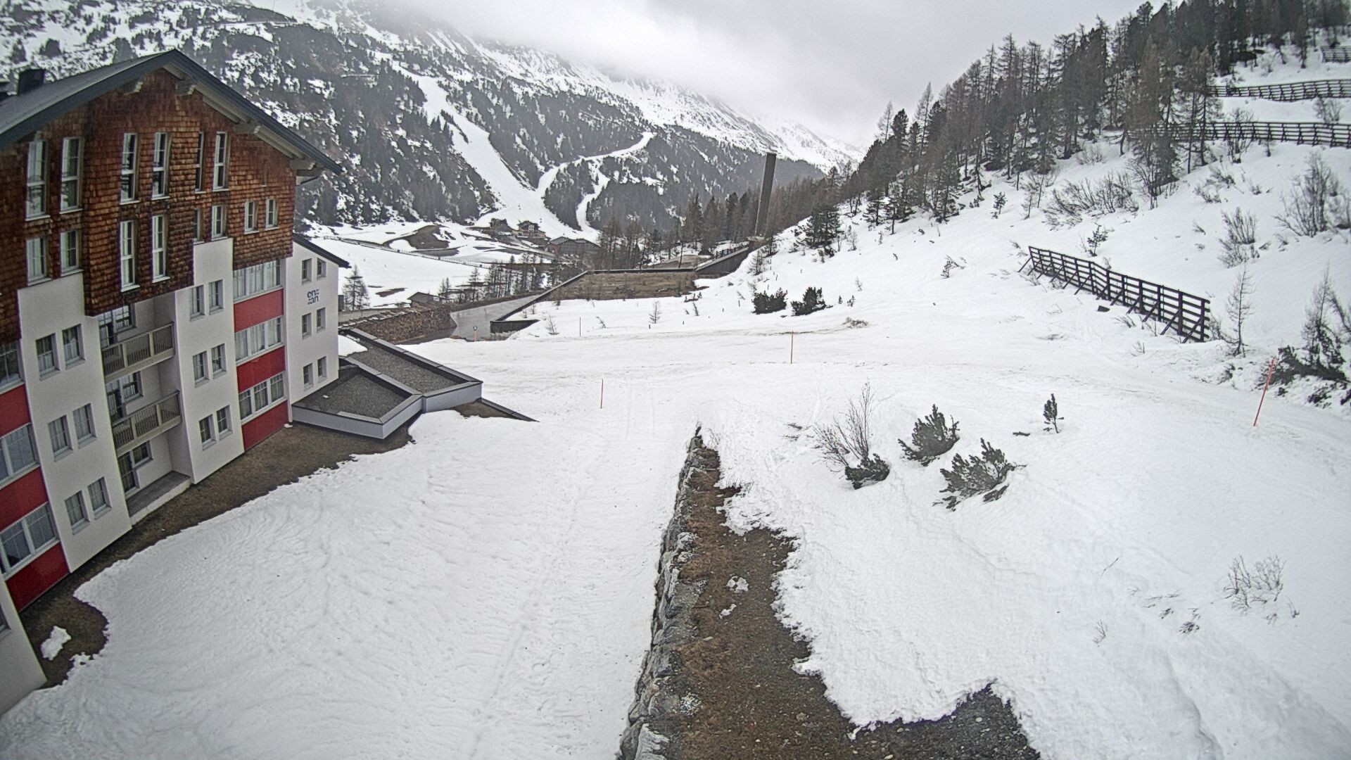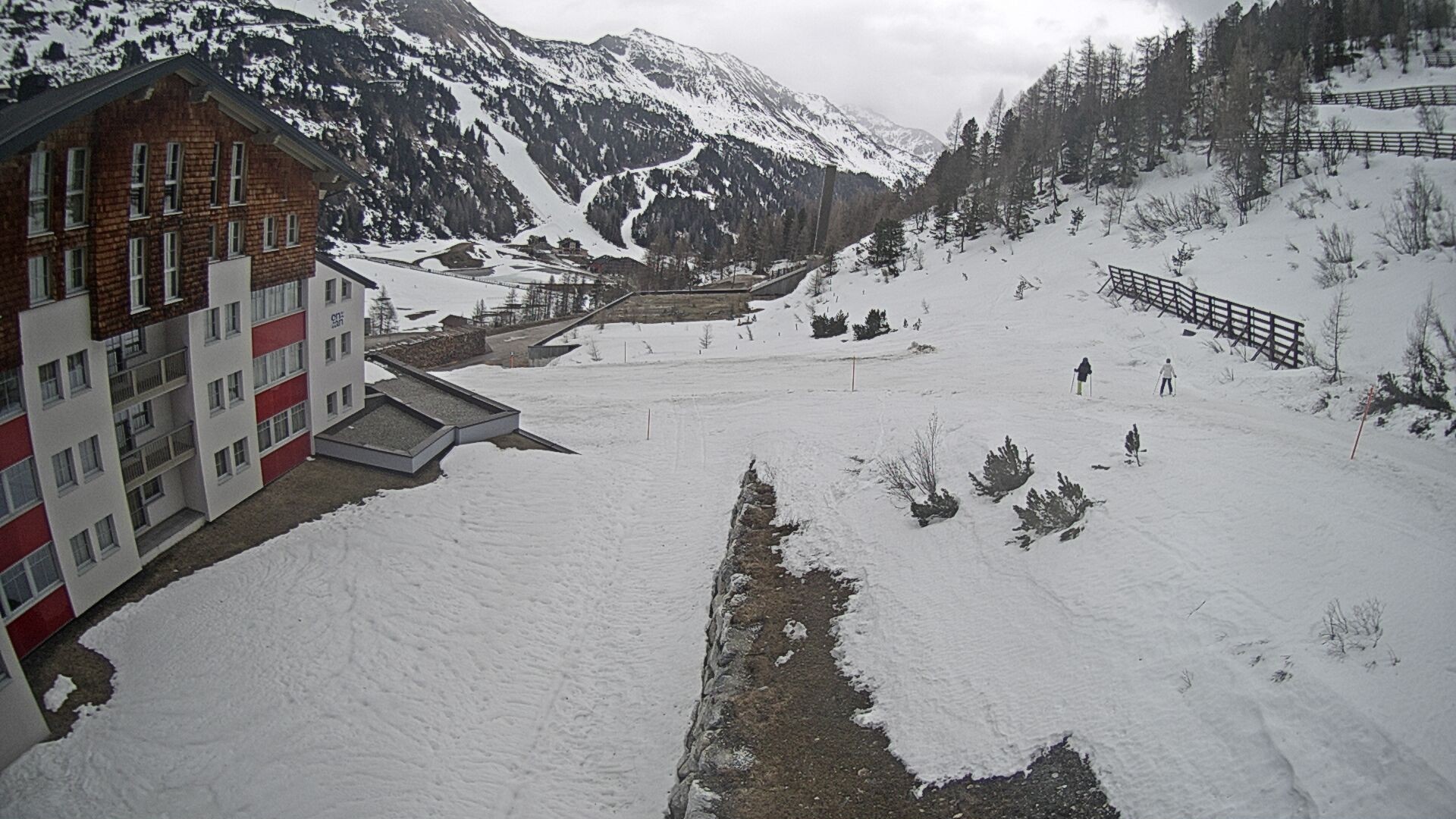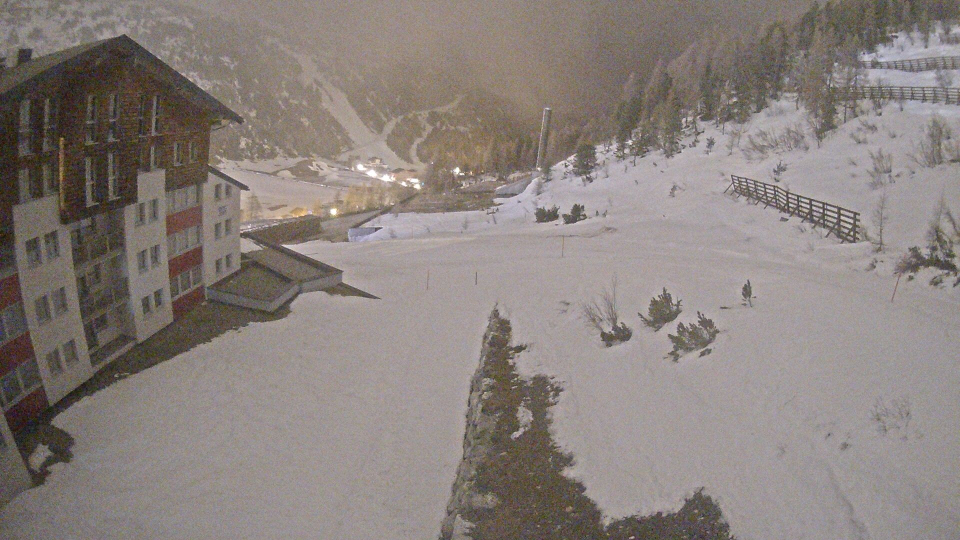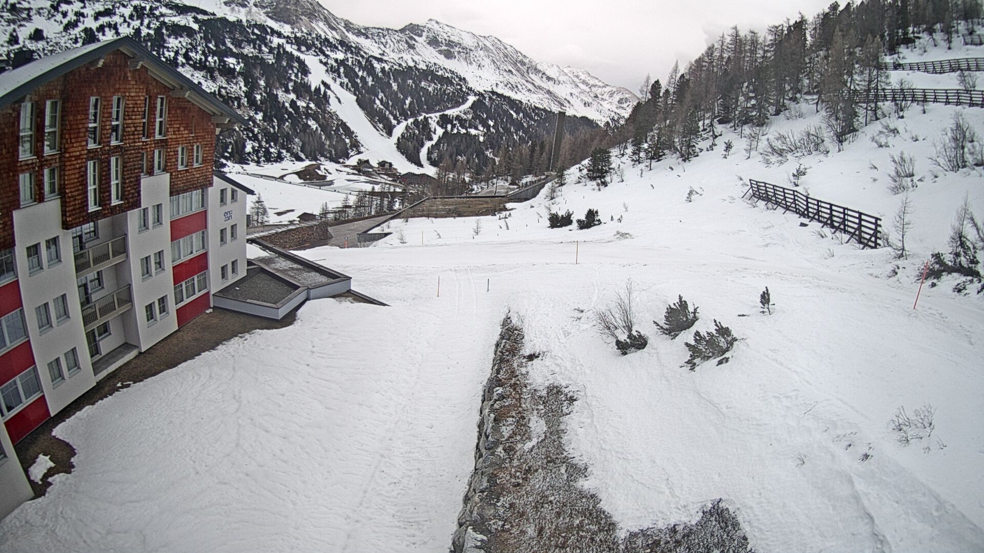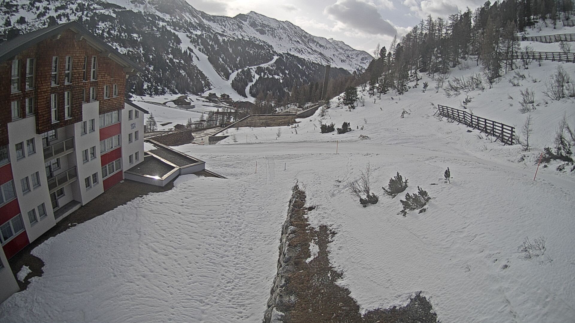 Ausblick vom Hotel Enzian in Obertauern (4 Sterne Superior). Es liegt direkt an der Piste. Direkt am Hotel führt eine blaue Familienabfahrt des Skigebiets vorbei.