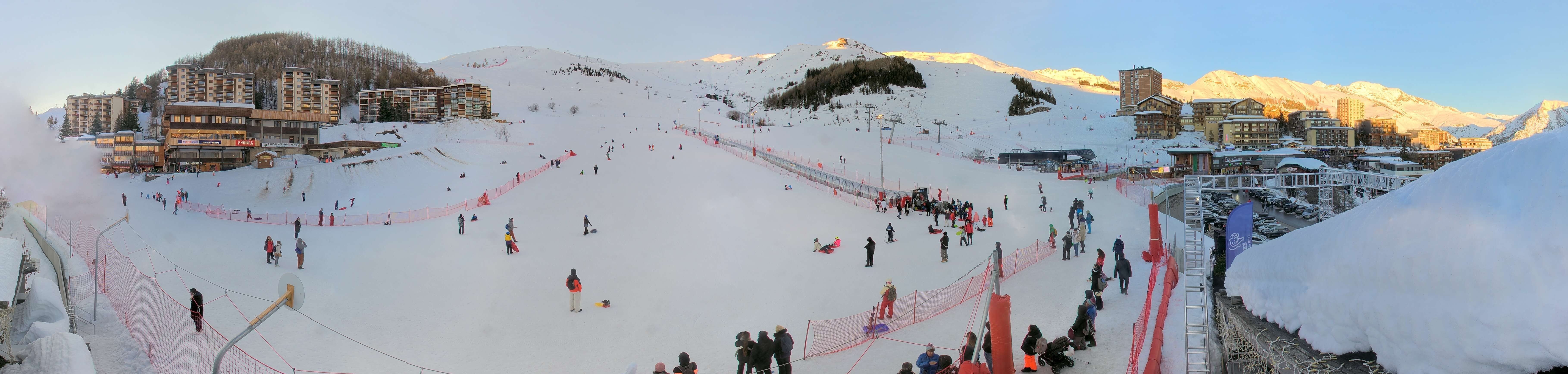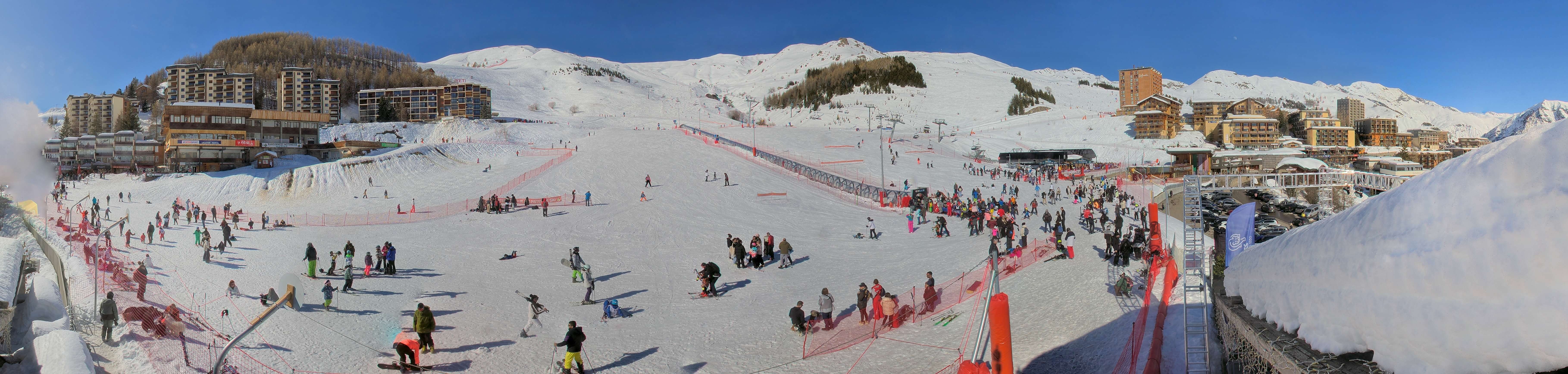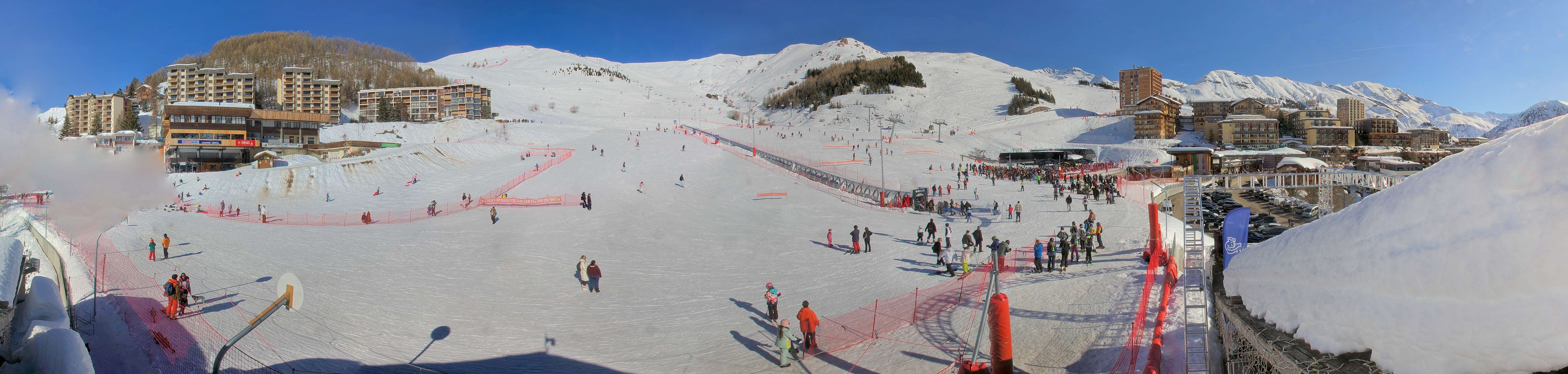 Blick über den Wintersportort Orcieres 1850. Er ist Ausgangspunkt für die Lifte und Pisten des gleichnamigen französischen Skigebiets in der Region Provence-Alpes-Cóte d'Azur.