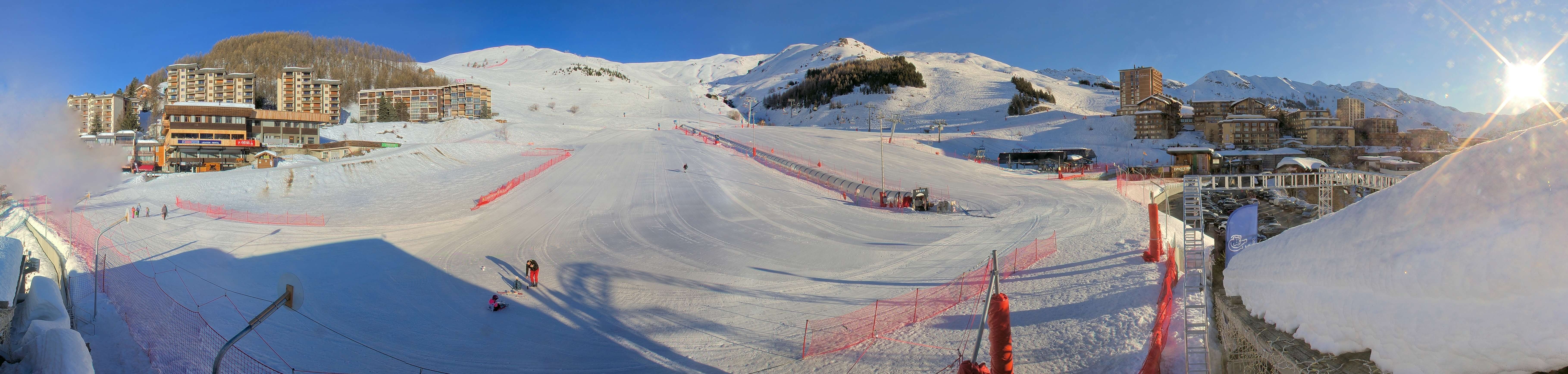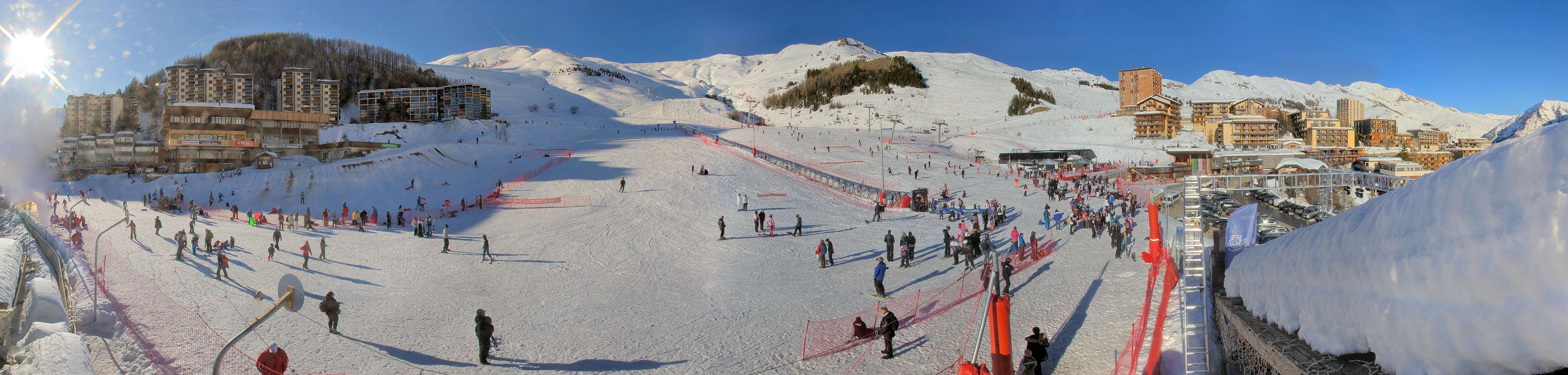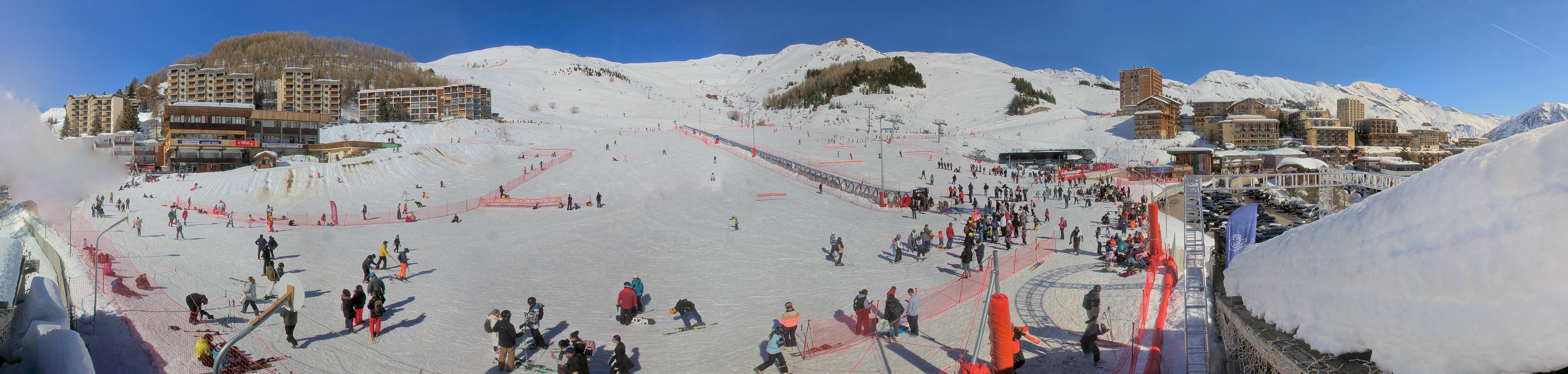 Blick über den Wintersportort Orcieres 1850. Er ist Ausgangspunkt für die Lifte und Pisten des gleichnamigen französischen Skigebiets in der Region Provence-Alpes-Cóte d'Azur.