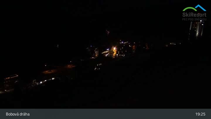 Blick auf die Rodelbahn in Pec pod Snezkou an der Schneekoppe im tschechischen Riesengebirge. Hier in diesem Bereich befindet sich auch ein großer Relaxpark mit Abenteuerspielplatz und Trampolinen.