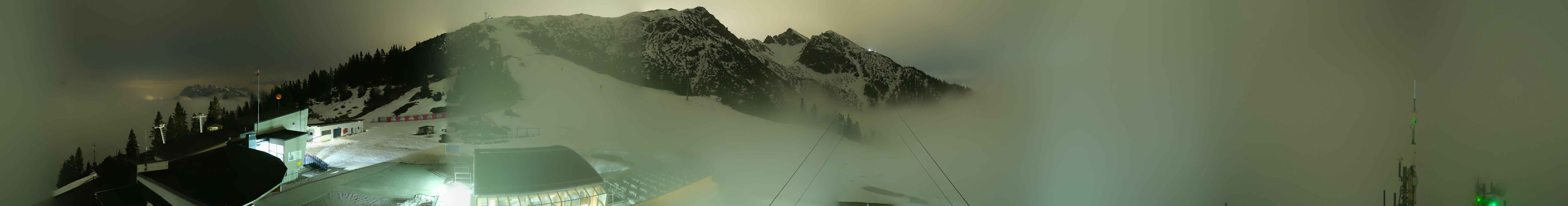 Panoramablick von der Rosshütte in Seefeld. Zu sehen sind die Pisten direkt an der Rosshütte mit Blick zum Härmelekopf (2224 m). Im Tal erkennt man den Ort Seefeld mit dem Gipfel der hohen Munde (2662 m) im Hintergrund.