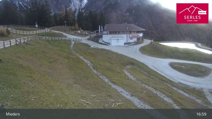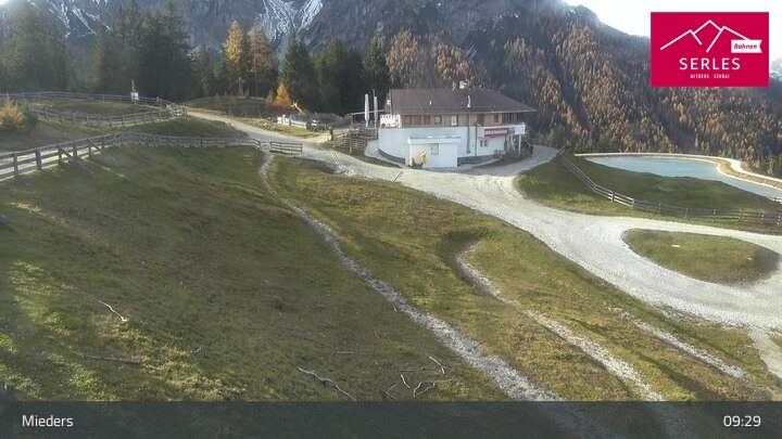 Herrlicher Blick auf den Hausberg von Mieders, die Serles, sowie auf die Rodelbahn und die Piste Waldrasteck im Tiroler Skigebiet Mieders. Gut zu erkennen sind außerdem die Bergstation der Serlesbahn am 1.600 Meter hohen Koppeneck, die Skihütte Koppeneck mit Spielplatz und der Speichersee.