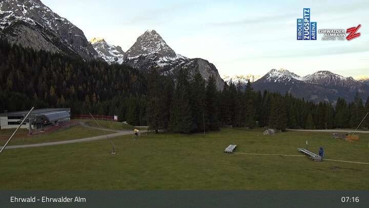 Blick auf die Ehrwalder Alm, das Kinderland und die sie umgebenden blau markierten Pisten.