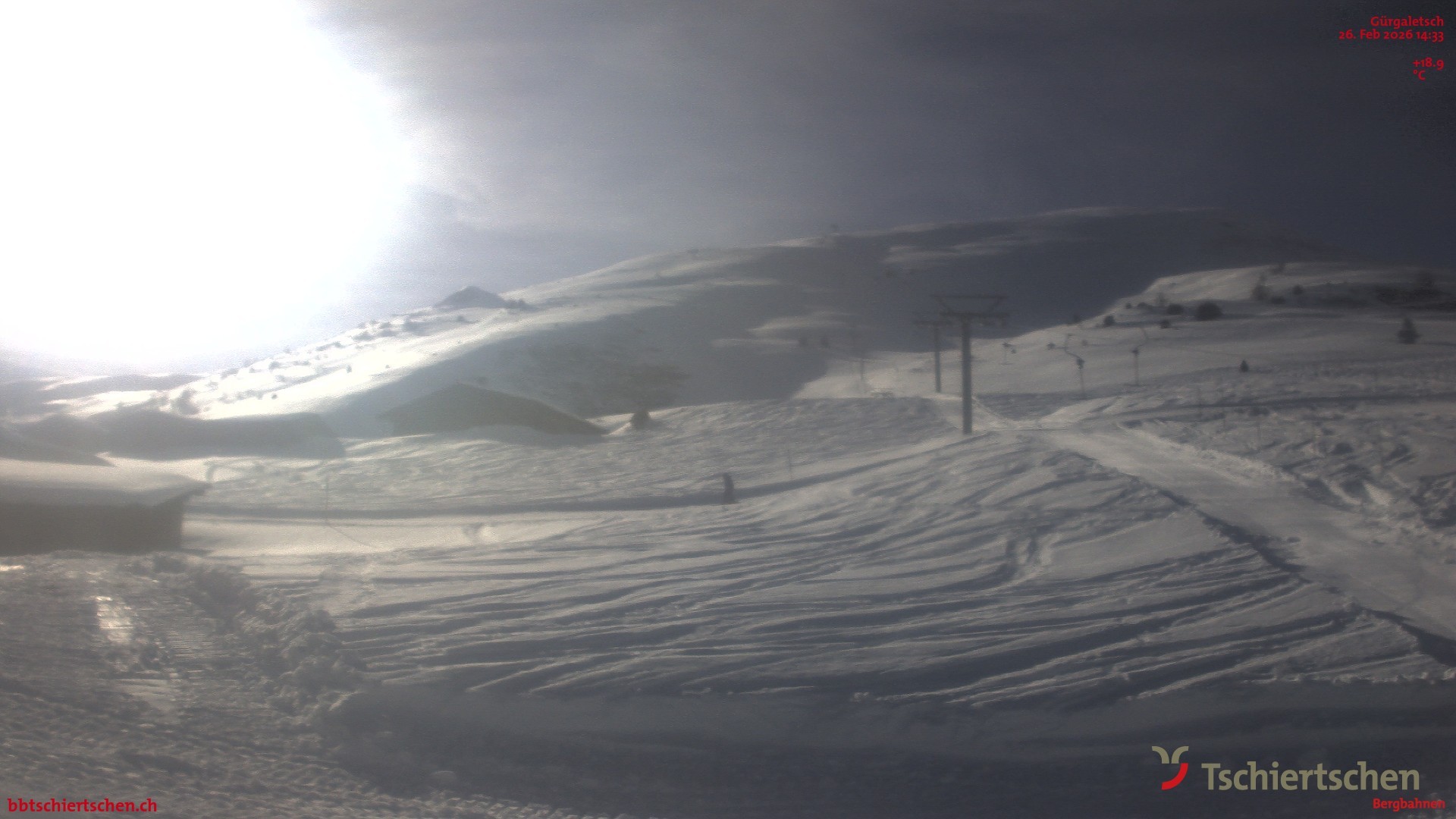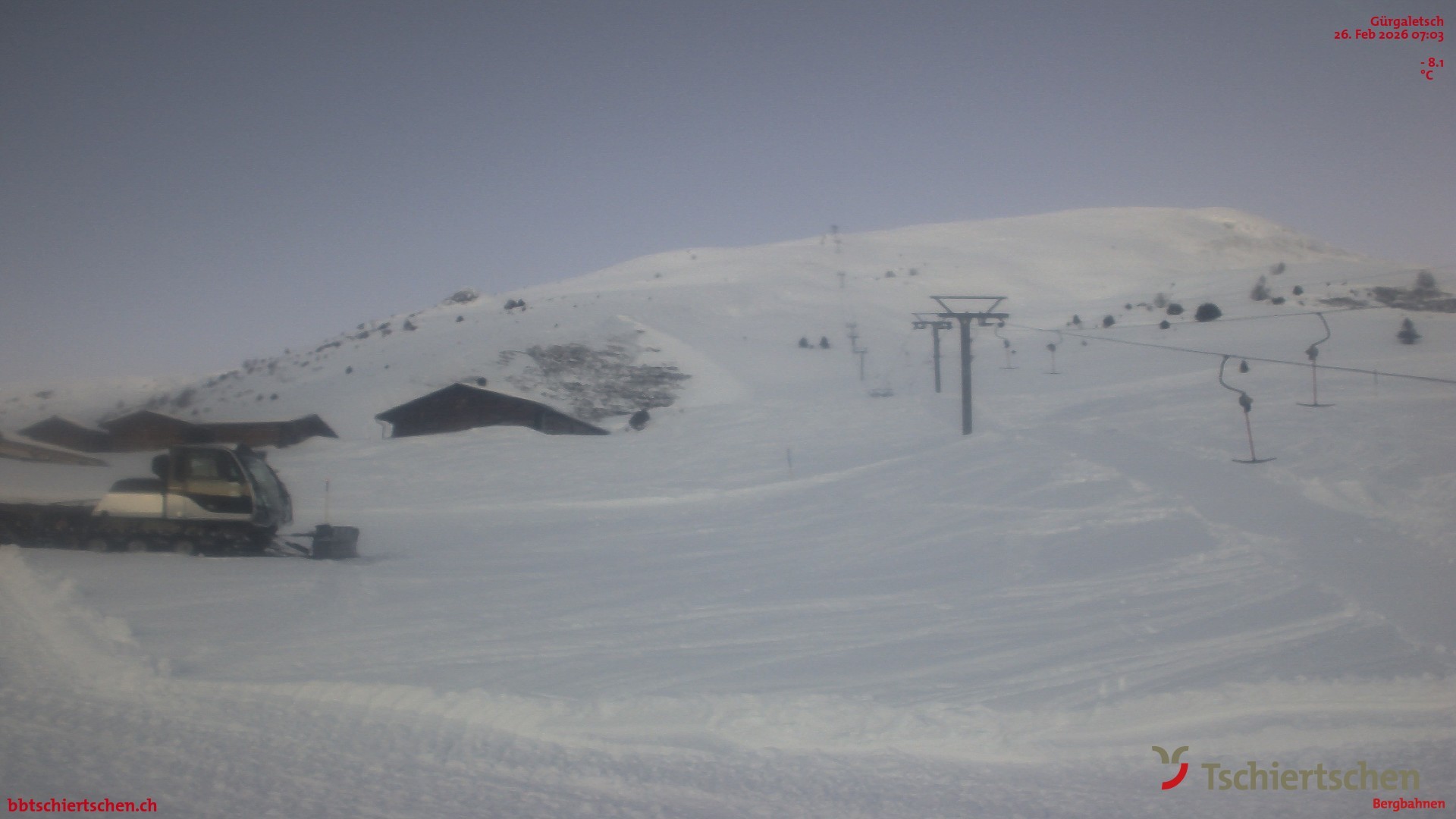 Die Webcam blickt den Berg Gürgaletsch (2450m) hinauf entlang des Schleppliftes im Skigebiet der Tschiertschen Bergbahnen von Alp Farur aus