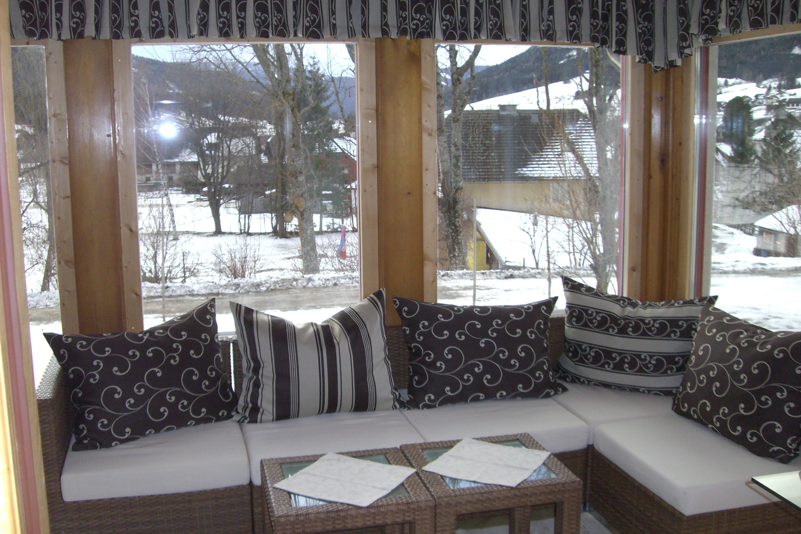 Wintergarten mit Sitzgarnitur als Wohnzimmer mit Terrasse.