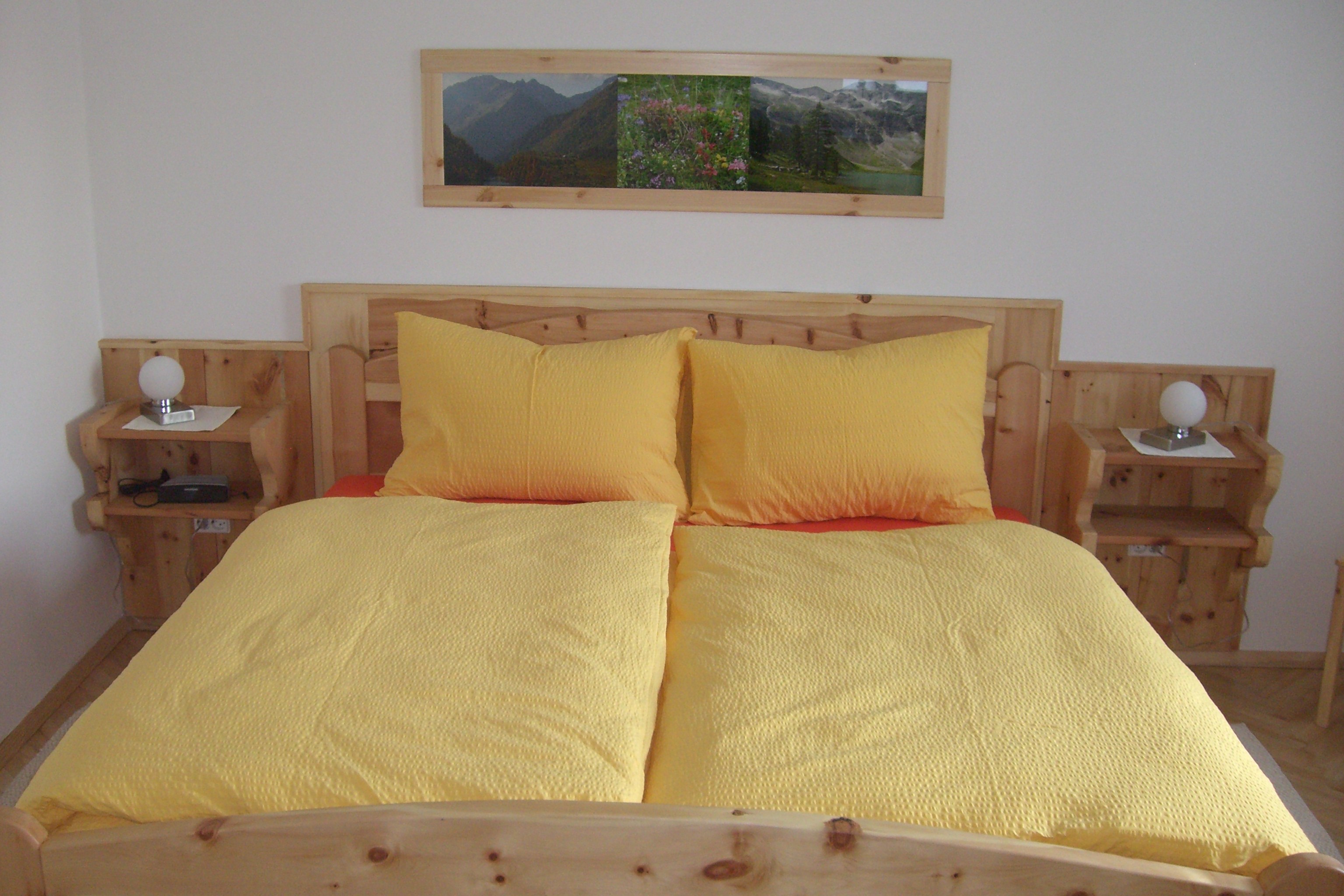 2 ruhige Schlafzimmer mit Zirbenholzdoppelbetten und großer, ausziehbarer Schlafcouch.