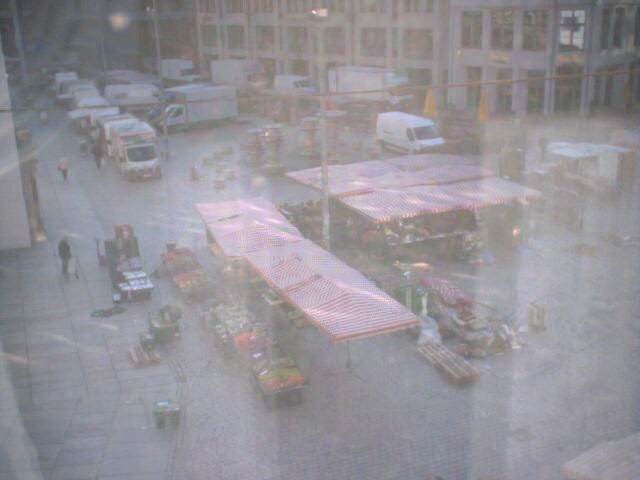 Blick vom Juwelier Roller auf den Markt in Chemnitz, wo täglich Händler ihre Waren auf dem Wochenmarkt anbieten. In der Adventszeit findet hier auch der beliebte Chemnitzer Weihnachtsmarkt statt.