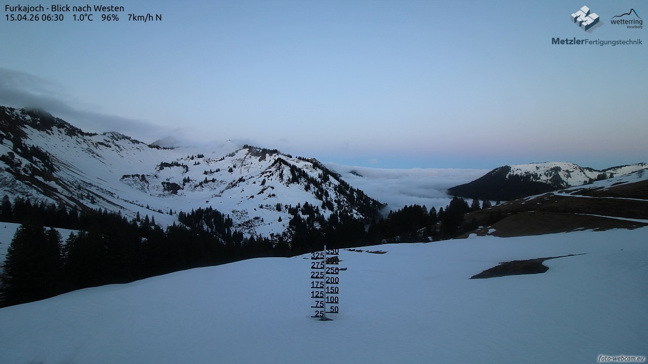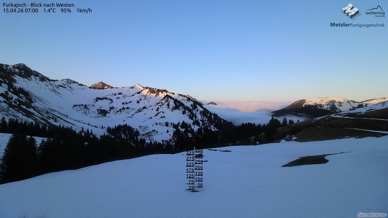 Die Webcam befindet sich am Furkajoch und zeigt den Blick nach Westen Richtung Kreuzspitze, Gerenspitze, Hochgerach, Säntis, Gapfohler Falba und Nob.