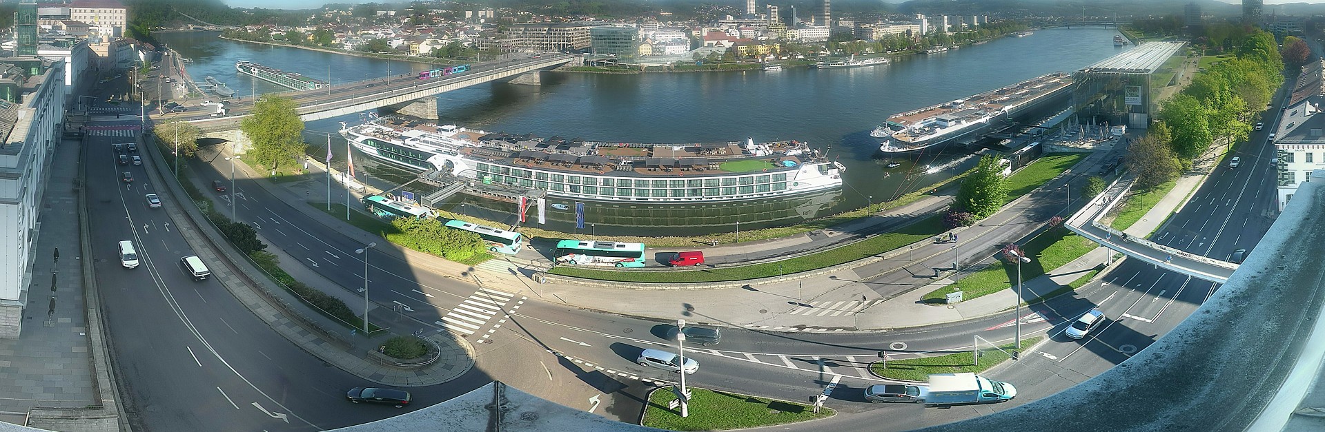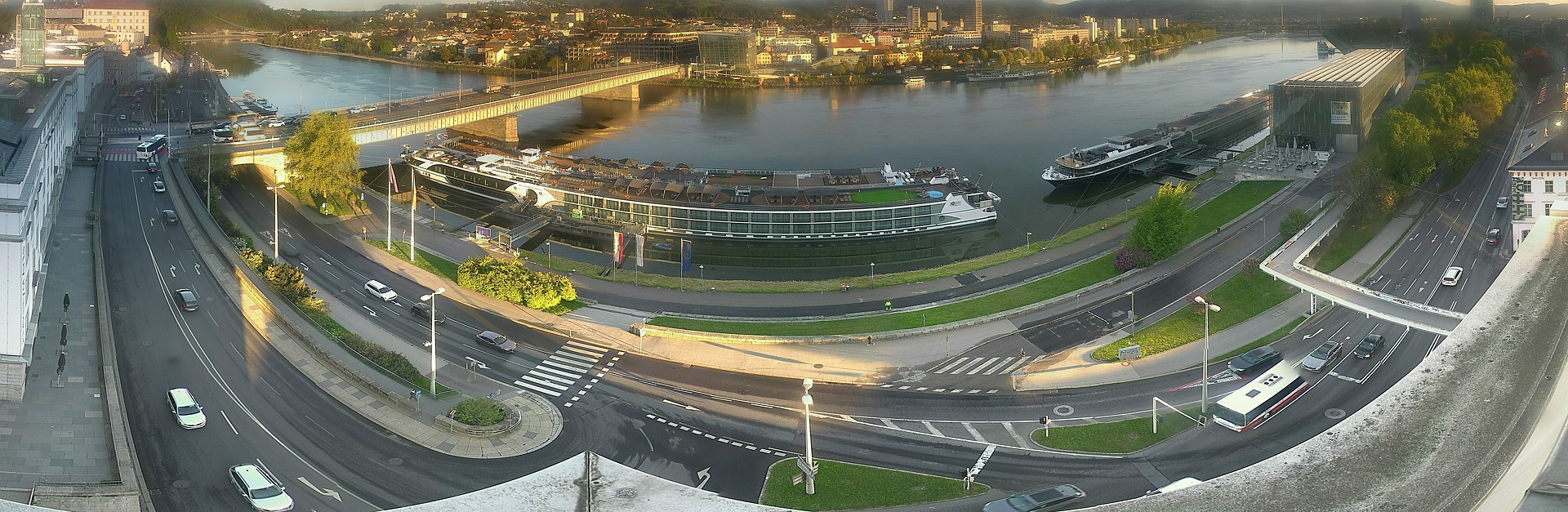 Rundumblick vom Linzer Generaligebäude auf die Donaulände und die Nibelungenbrücke über die Donau.