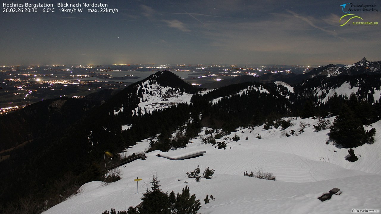 Archiviertes Webcam Bild: Hochries Bergstation - Blick nach Nordosten am 26 Feb 2026 um 20:52 Uhr Aktuell
