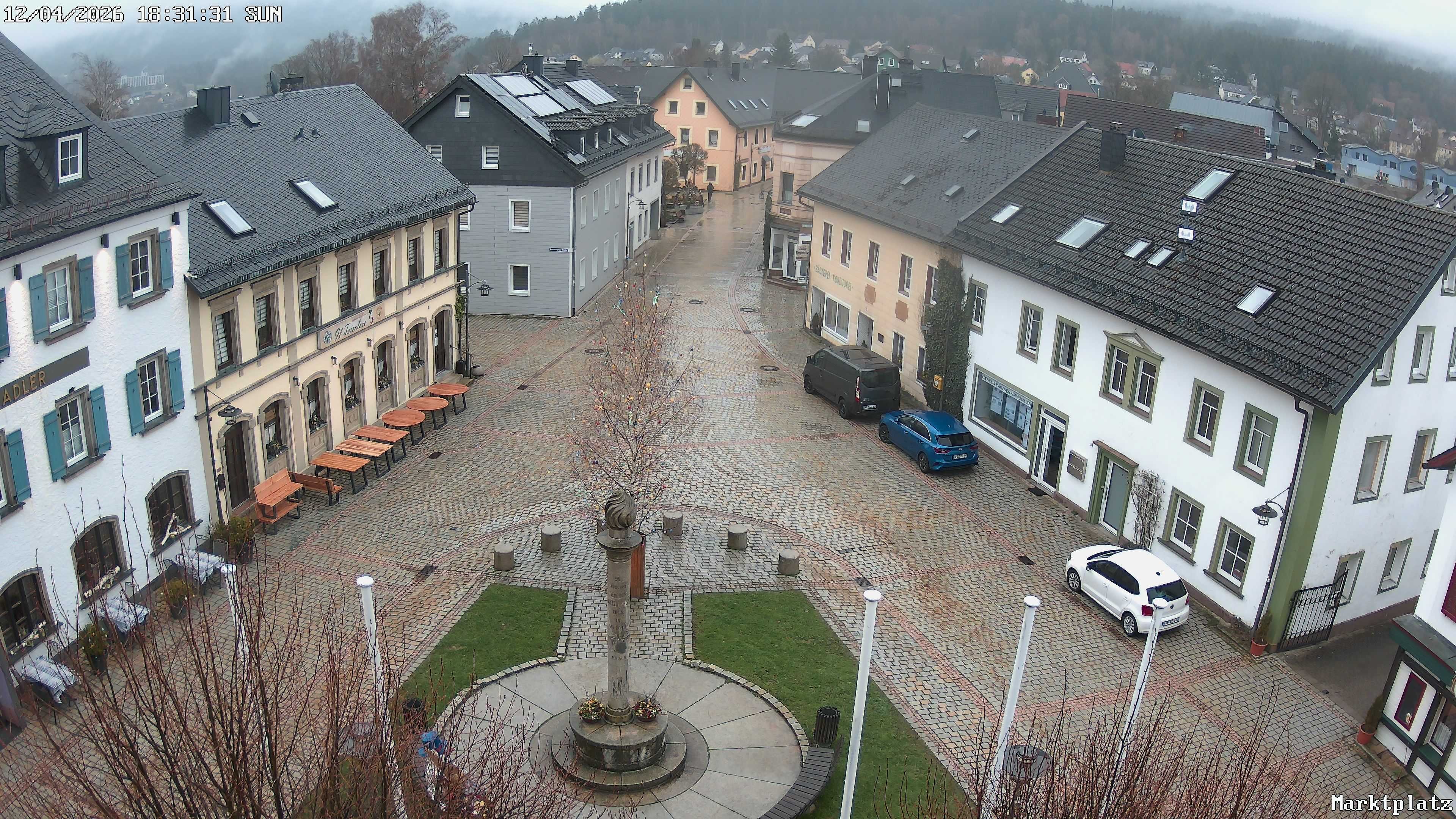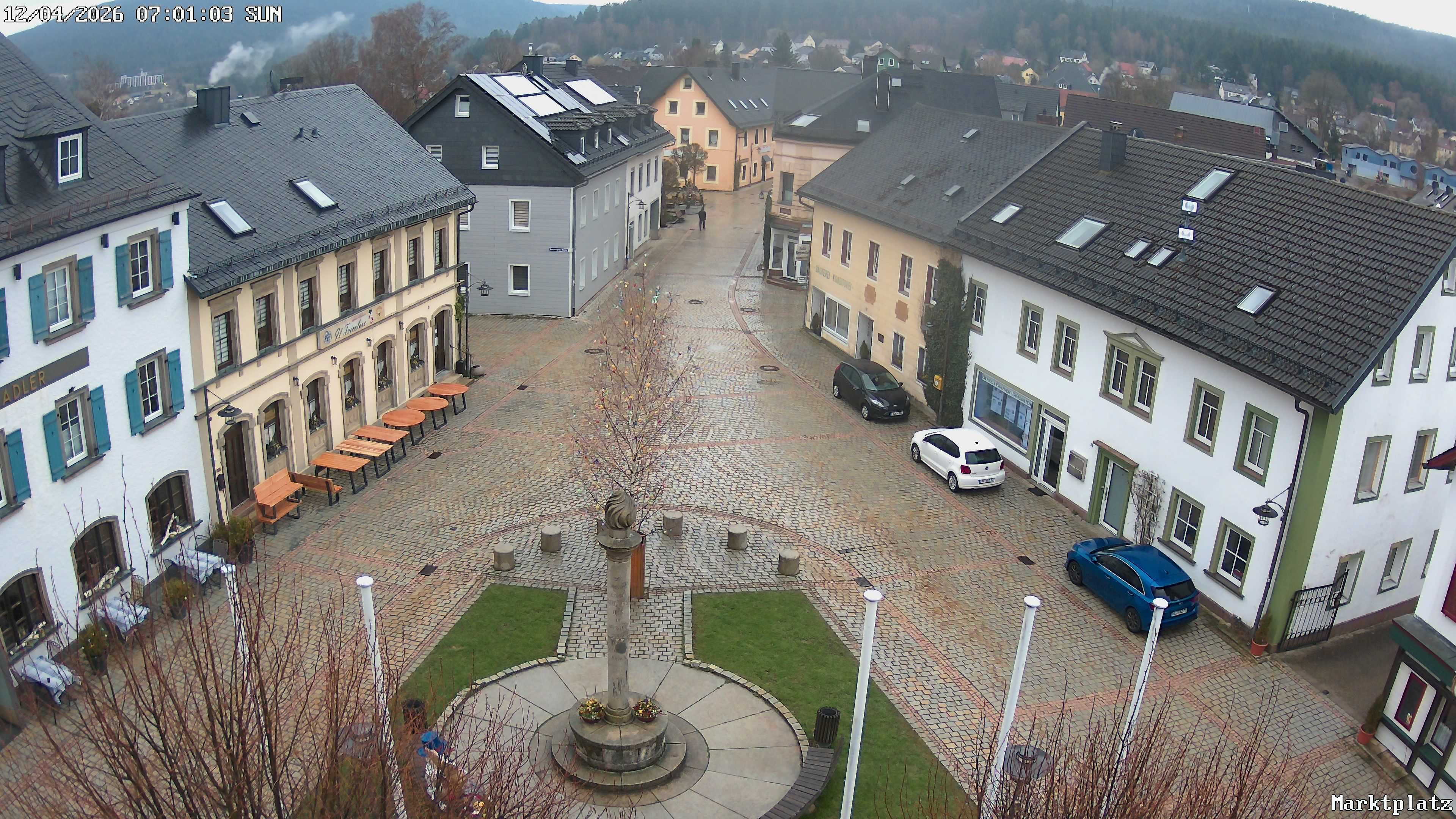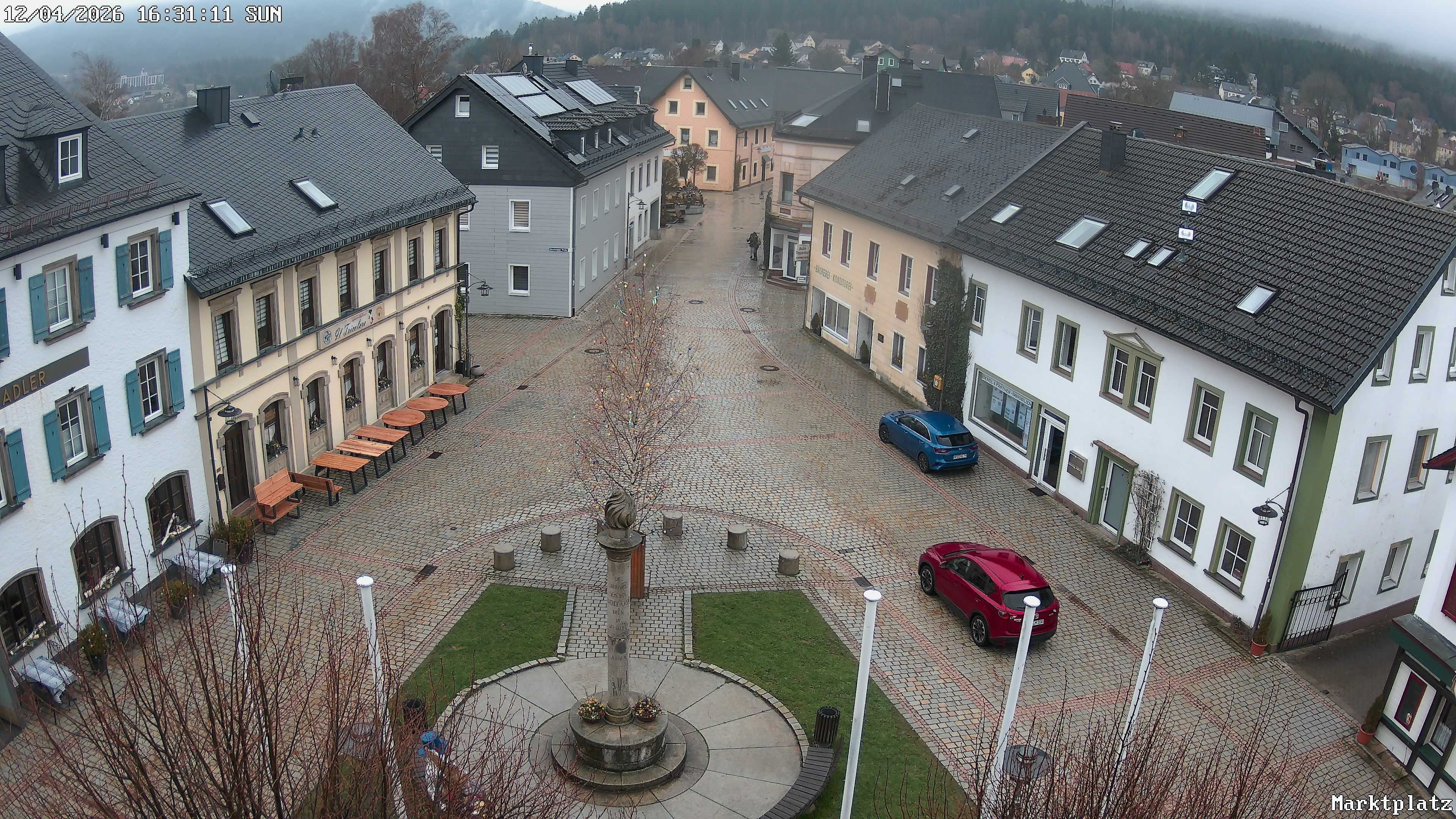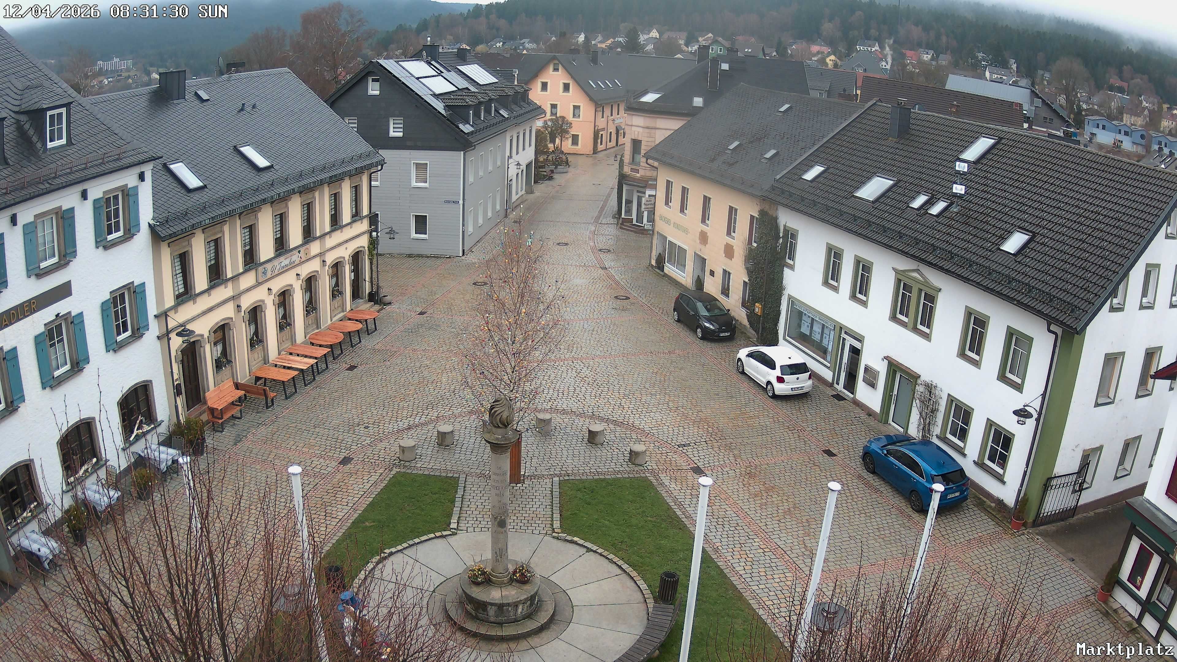 Blick über den Marktplatz von Bischofsgrün im Fichtelgebirge. Im Winter wird hier seit Jahren der größte Schneemann Deutschlands aufgebaut. Im Sommer ist der Maibaum zu sehen.