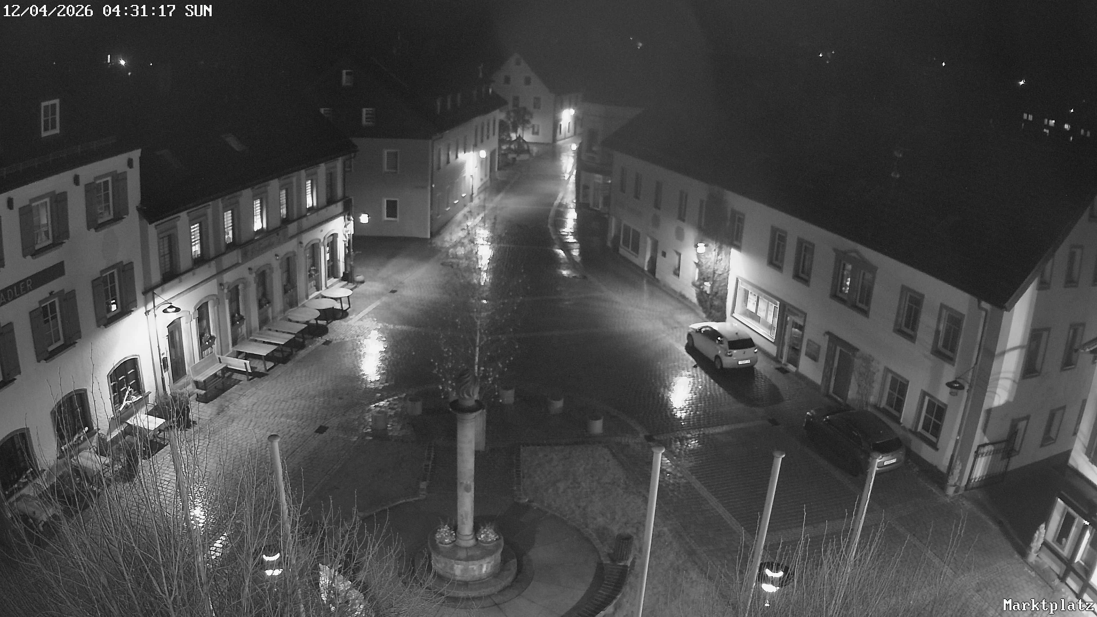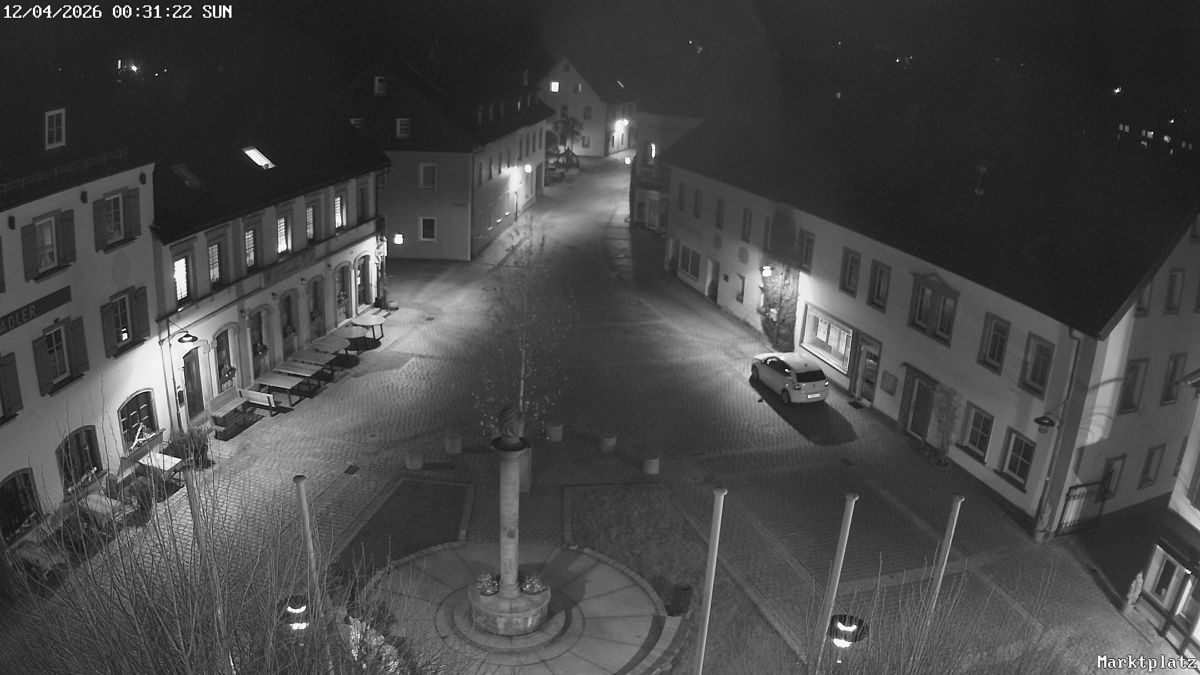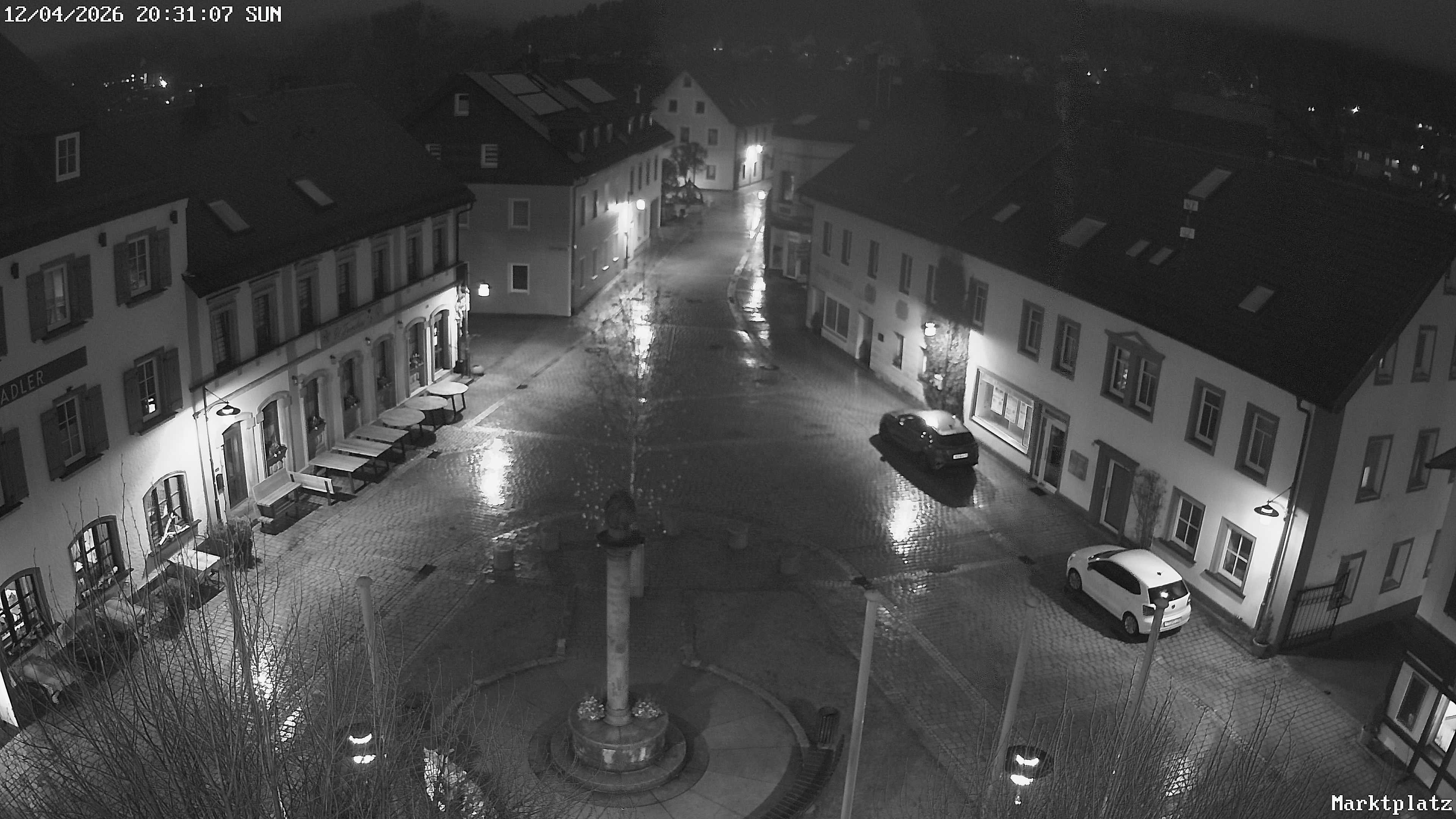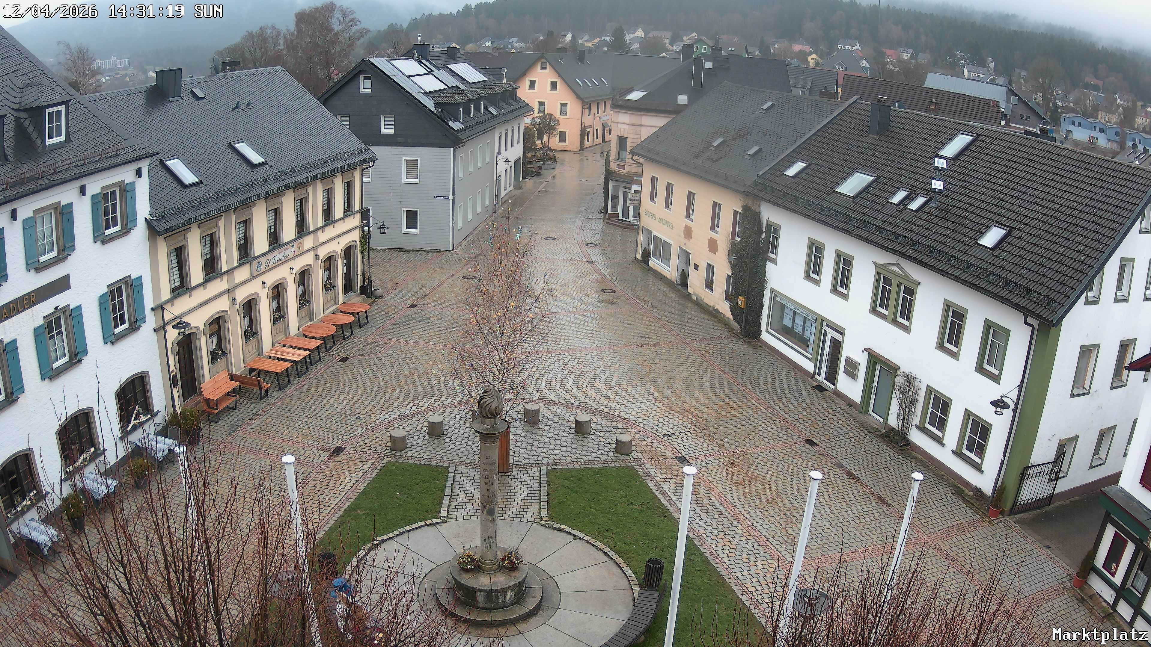 Blick über den Marktplatz von Bischofsgrün im Fichtelgebirge. Im Winter wird hier seit Jahren der größte Schneemann Deutschlands aufgebaut. Im Sommer ist der Maibaum zu sehen.