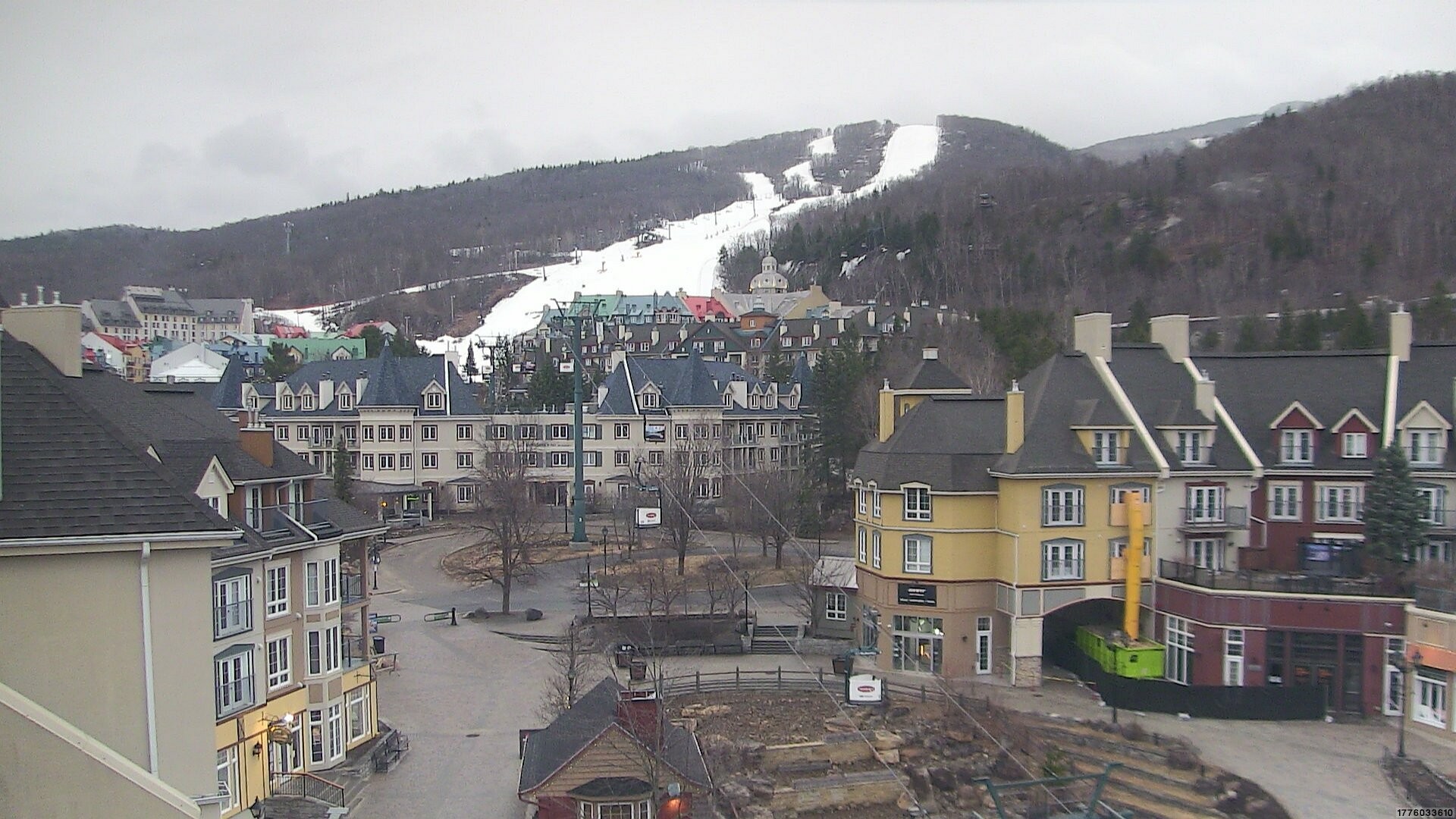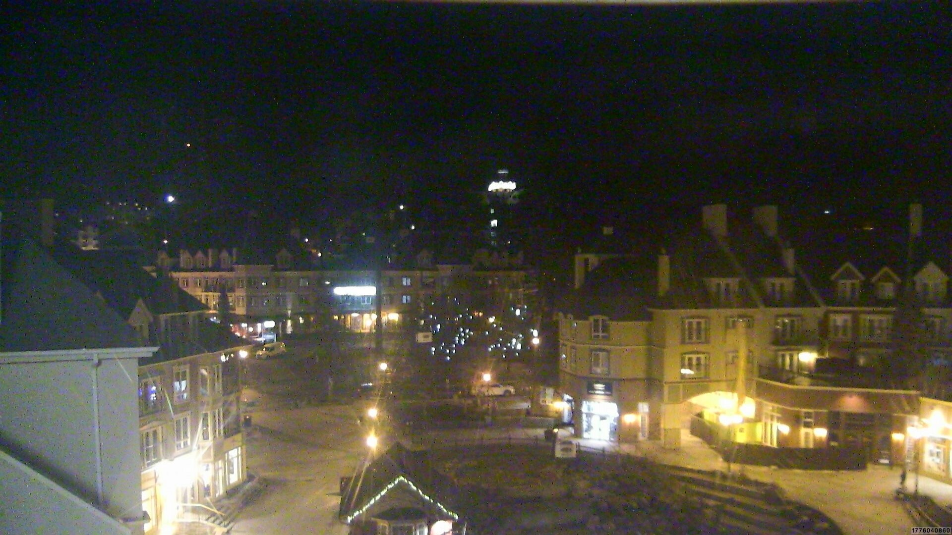 Blick auf den Place des Voyageurs in Tremblant, einem kanadischen Skigebiet. Hier befindet sich auch Talstation Cabriolet-Bahn, eine Zubringerbahn ins Skigebiet.