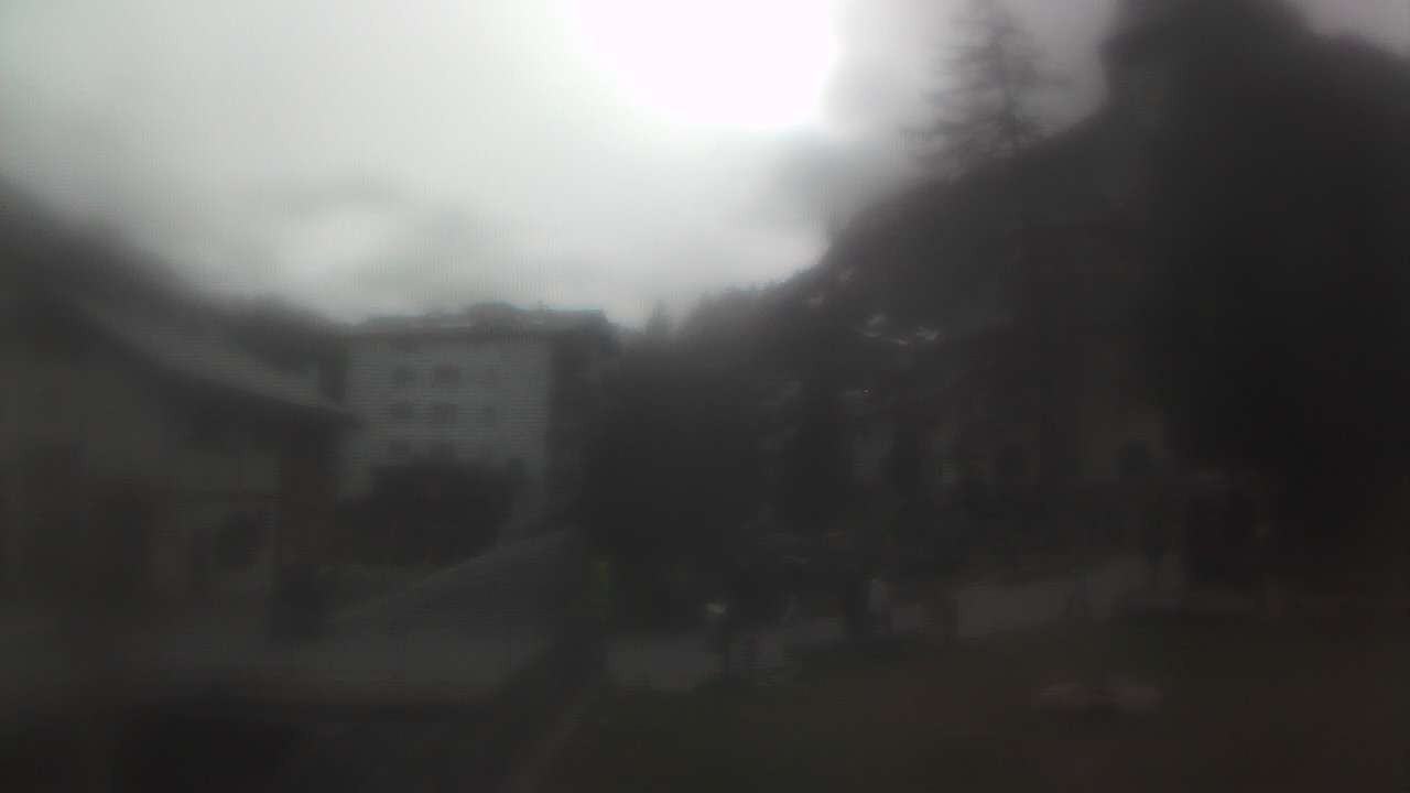 Die Webcam steht im Zentrum von Zermatt neben der Kirche. Bei guter Sicht kann man das Matterhorn erkennen.